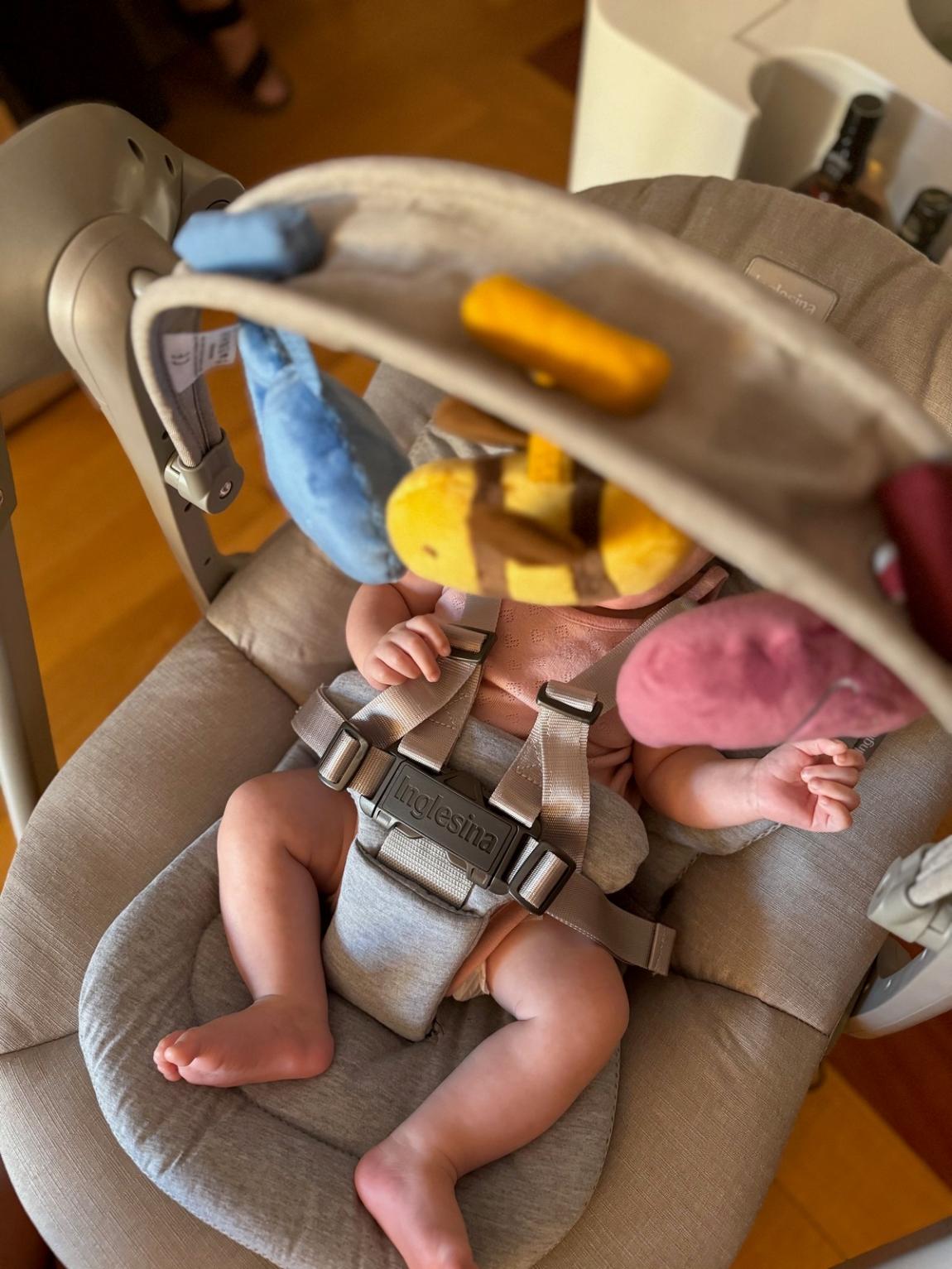 Η φαλαινίτσα, η μελισσούλα και το ελεφαντάκι δεν είναι τυχαία εκεί. Διεγείρουν τη νοητική ανάπτυξη των μωρών και είναι εύκολα προσβάσιμα στα λιλιπούτεια χεράκια! Ενώ είναι ακόμα πολύ βρεφάκι, έκανε μια πρώτη κίνηση να τα πιάσει και μετά έμεινε για πολλή ώρα να τα χαζεύει με θαυμασμό. Ο μεγάλος ενθουσιασμός ήρθε όμως μόλις πατήσαμε το κουμπάκι και η κούνια άρχισε να κουνιέται, ενώ η Ιριάνα έβαλε και μια γλυκιά μουσικούλα για την αδερφή της.