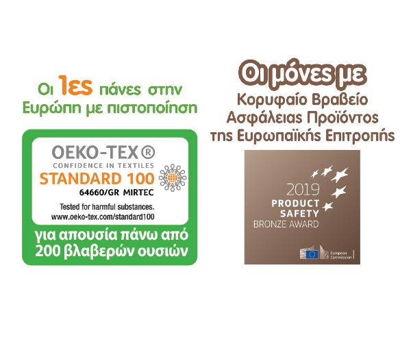 - Είναι οι πρώτες στην Ευρώπη που έλαβαν τη διεθνή πιστοποίηση Oeko-Tex® Standard 100 ότι δεν περιέχουν πάνω από 200 βλαβερές ουσίες.