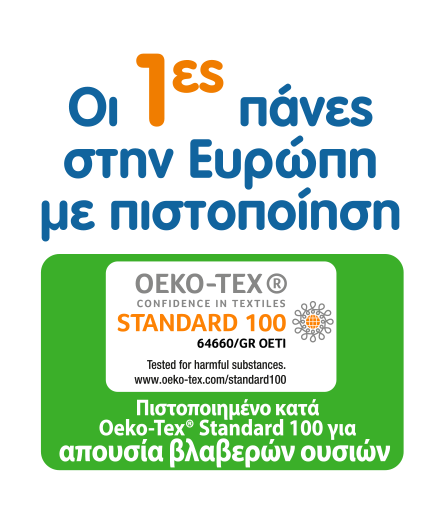 • Είναι οι πρώτες πάνες στην Ευρώπη που πιστοποιήθηκαν με τη διεθνή πιστοποίηση Oeko-Tex® Standard 100 για απουσία πάνω από διακοσίων βλαβερών ουσιών.