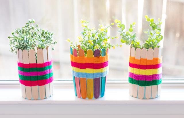 3. Κολλάμε τα ξυλάκια προσεκτικά γύρω από το γλαστράκι.