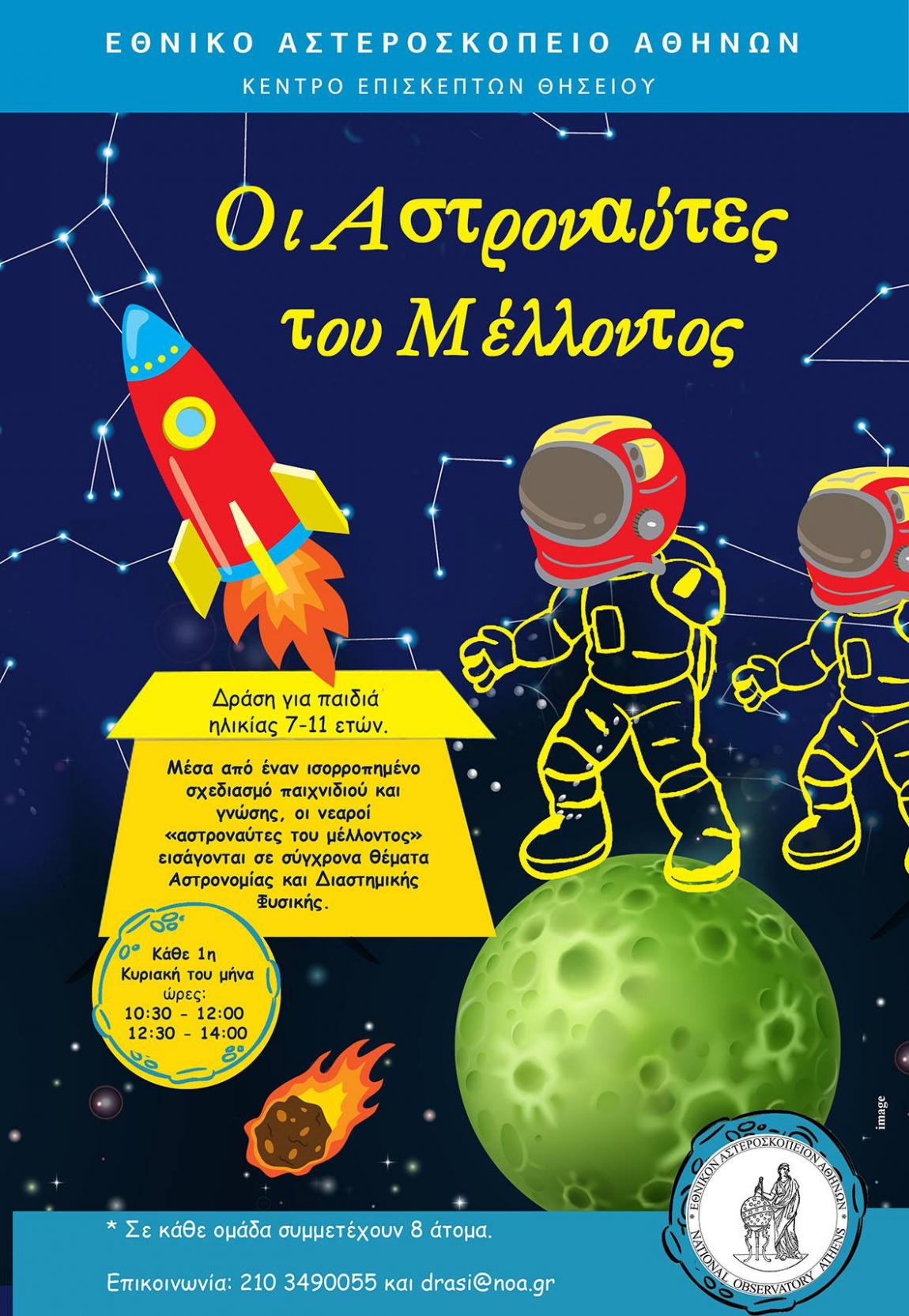 Οι νεαροί «Αστροναύτες του Μέλλοντος» μέσα από έναν ισορροπημένο σχεδιασμό παιχνιδιού και γνώσης, εισάγονται σε σύγχρονα θέματα Αστρονομίας και Διαστημικής Φυσικής. Το ταξίδι τους με αφετηρία τη Γη και προορισμό την εξερεύνηση του Διαστήματος, πραγματοποιείται μέσω επιμορφωτικών και διασκεδαστικών δοκιμασιών και ολοκληρώνεται με τον σχεδιασμό μιας μοναδικής Διαστημικής Αποστολής. Εργαστήριό τους θα γίνει το μουσείο Γεωαστροφυσικής του Εθνικού Αστεροσκοπείου Αθηνών, στο λόφο των Νυμφών στο Θησείο.