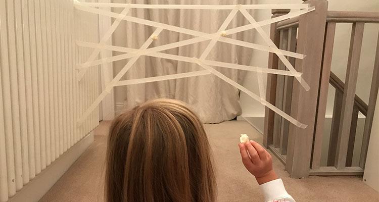 #7 Ιστός από ταινίες: Παίρνουμε την χαρτοταινία του μπαμπά και κολλάμε διαγώνιες λωρίδες από τοίχο σε τοίχο στο διάδρομο του σπιτιού. Πρέπει να περάσουμε ανάμεσα από τις ταινίες σαν τον spiderman χωρίς να κολλήσουμε.