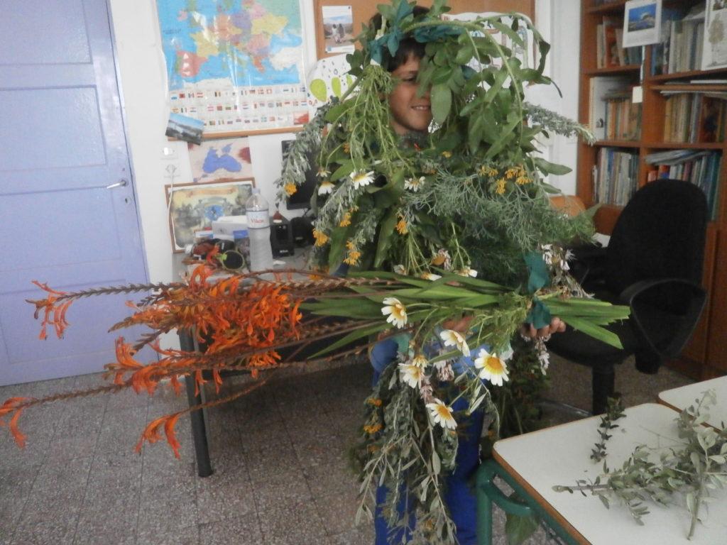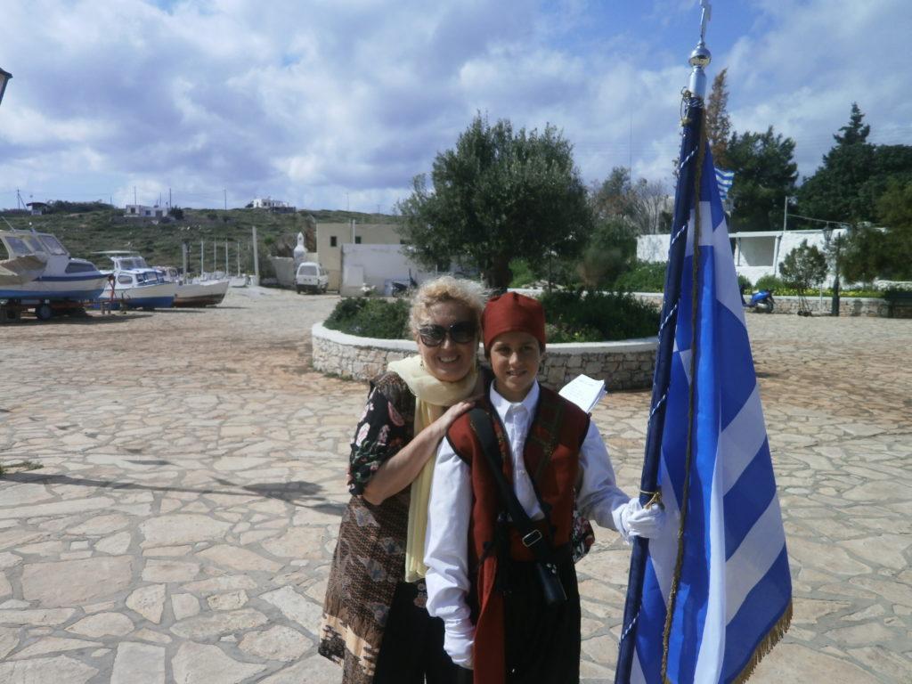 «Είχαμε πει από πέρυσι να κάνουμε ένα πρότζεκτ για το νερό, με τις δυσκολίες που έχουμε εδώ – λειψυδρία, έξι μήνες δεν βρέχει ούτε σταγόνα, έχουμε ξηρασία… Όταν μάθαμε για τον διαγωνισμό με τον Χρήστο, παρά το φορτωμένο πρόγραμμά μας αποφασίσαμε να συμμετάσχουμε. Για αρκετό καιρό σκεφτόμασταν τι θα μπορούσαμε να εκπονήσουμε. Οπότε αποφασίσαμε, επειδή μας αρέσουν πολύ τα ήθη και τα έθιμα, που πολλά είναι ξεχασμένα, αντί να δείξουμε κάτι για τη θάλασσα ή για πηγάδια και τρόπους προμήθειας νερού σ’ ένα ακριτικό νησί της Δωδεκανήσου, να αναπαραστήσουμε ένα έθιμο, την Περπερούνα, που υλοποιούνταν στα χωριά σε περιόδους ξηρασίας, σε περιοχές της Μακεδονίας. Έντυναν ένα αγόρι ή ένα κορίτσι με φυλλωσιές, γύριζε σ’ όλο το χωριό και ο κόσμος του έριχνε νερό. Έντυσα κι εγώ τον Χρήστο με φυλλωσιές απ’ το κεφάλι μέχρι τα πόδια. Είχαμε και οκτώ κατοίκους που μας ακολουθούσαν, μια και είμαστε πολλοί λίγοι εδώ, 35 κάτοικοι όλοι κι όλοι. Μας βιντεοσκόπησε ένας κύριος από την Πάτμο που έτυχε να είναι εδώ εκείνη την ημέρα. Ήταν μάλιστα Δευτέρα 9 Μαρτίου, μία ημέρα πριν μας κλείσουν μέσα για τον κορωνοϊό. Το στείλαμε και πήραμε το τρίτο τιμητικό βραβείο στην κατηγορία βίντεο στα δημοτικά σχολεία! Χαρήκαμε πολύ γιατί ήταν 400 συμμετοχές από όλον τον κόσμο».