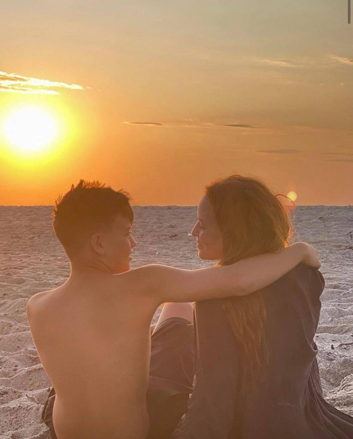 Η παρουσιάστρια απολαμβάνει το ηλιοβασίλεμα στην αγκαλιά του μεγαλύτερου γιου της Φίλιππου και το χαμόγελό της δεν κρύβεται...
