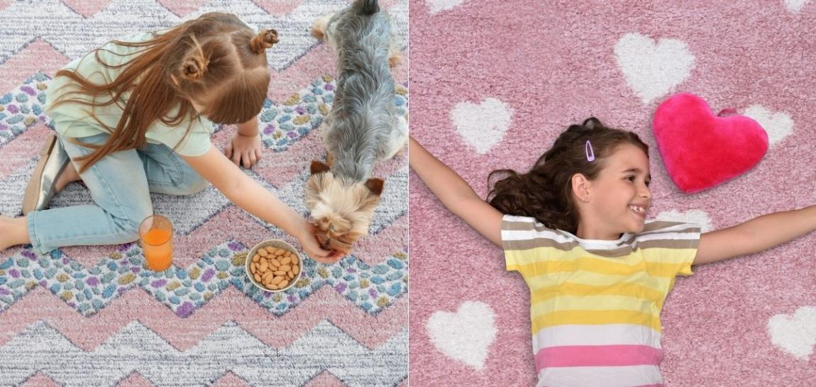 Από αριστερά: Παιδικό χαλί Diamond kids, ροζ με ζικ ζακ ρίγες και καραμελίτσες | Shaggy παιδικό χαλί Cocoon, ροζ με καρδούλες
