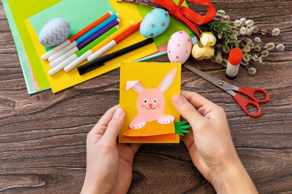 Πάρτε ένα χρωματιστό χαρτόνι, κόψτε ένα παραλληλόγραμμο και διπλώστε το στη μέση για να γίνει η βάση. Σε ένα άλλο ροζ ή γαλάζιο χαρτόνι, σχεδιάστε ένα λαγουδάκι, και σε ένα πορτοκαλί χαρτόνι ένα καρότο (μην ξεχάσετε το πράσινο κοτσάνι του!). Κόψτε τα σχέδια με ψαλίδι και κολλήστε τα στην κάρτα.