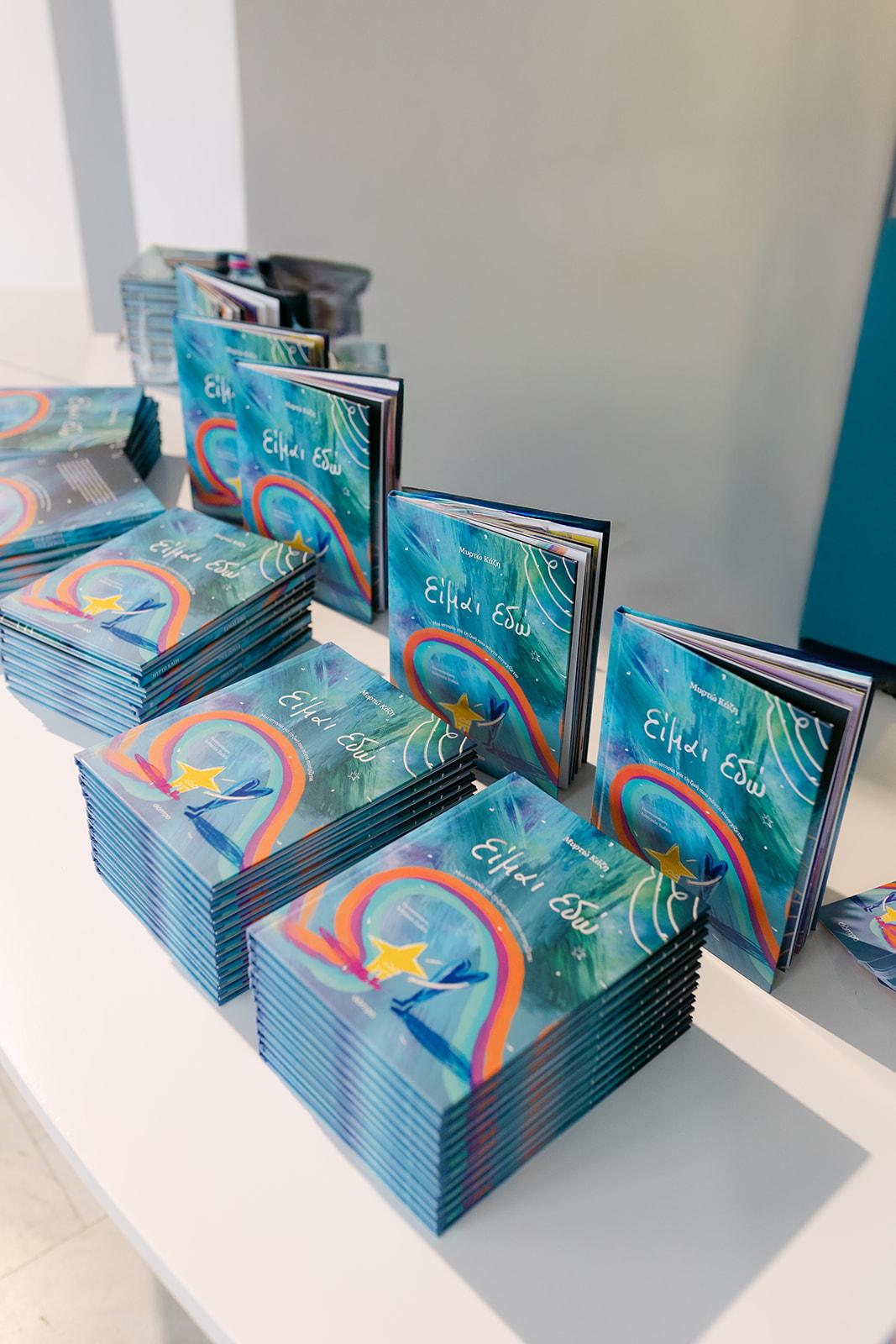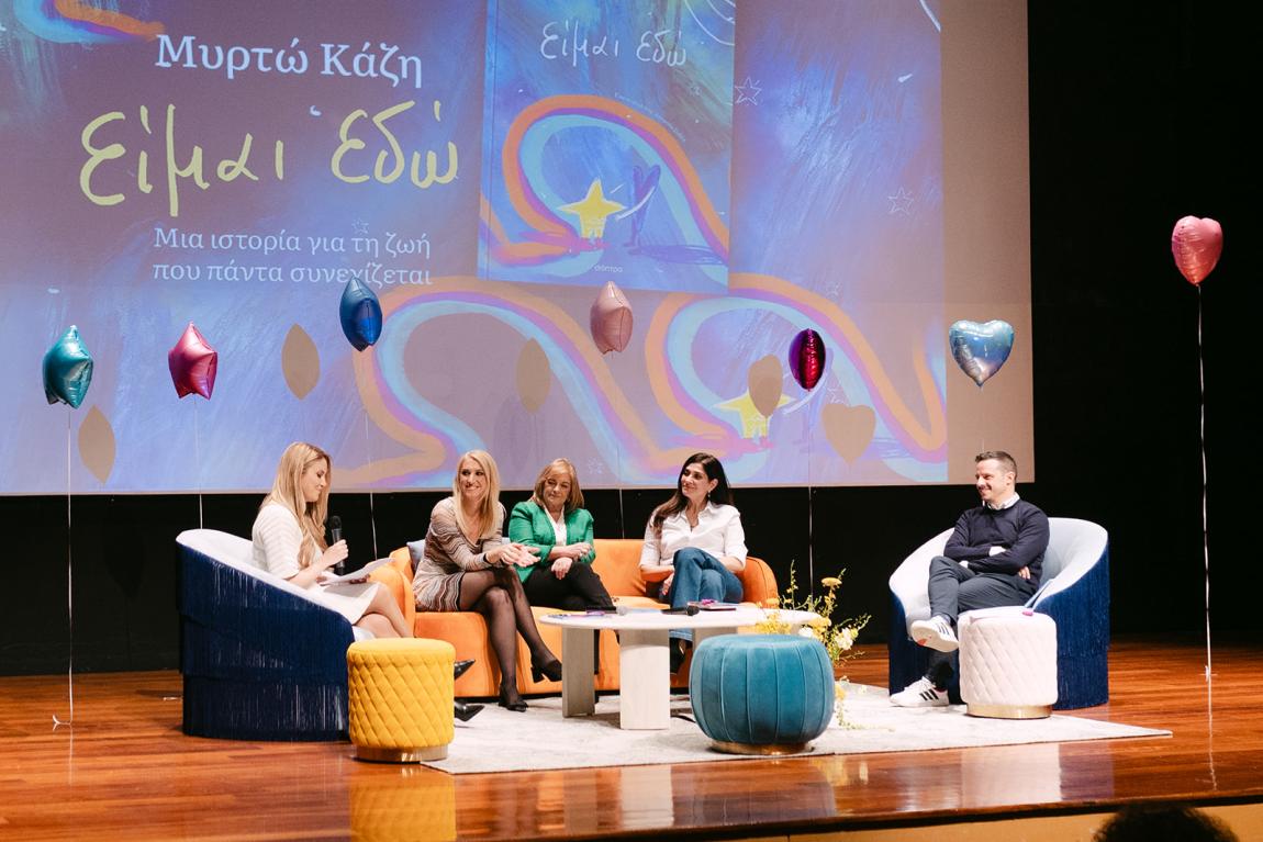 Στη συνέχεια, η Μυρτώ Κάζη, αφηγήθηκε με γλαφυρότητα και το δικό της χαρακτηριστικό ύφος, τον τρόπο με τον οποίο έγραψε το παραμύθι αυτό, λίγες ώρες αφότου ο μπαμπάς της έφυγε από τη ζωή. Όπως σημειώνει και η ίδια: «Το "Είμαι εδώ" γεννήθηκε από την επιθυμία μου να μοιραστώ με τα παιδιά -αλλά και με το παιδί που όλοι κρύβουμε μέσα μας- πως, παρά τις δυσκολίες, τις αναποδιές και τις απώλειες, η ζωή παραμένει το πιο σπουδαίο δώρο, και, τελικά, πάντα συνεχίζεται».