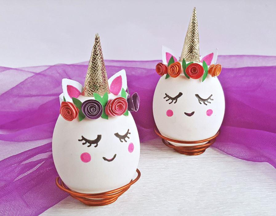 Κόψτε δύο μικρά ίδια τρίγωνα από λευκό χαρτόνι και σχεδιάστε δύο μικρότερα τρίγωνα με μαρκαδόρο για να δημιουργήσετε τα αυτιά του μονόκερου. Δημιουργήστε έναν κώνο από ασημί, χρυσό ή οποιοδήποτε χρωματιστό χαρτόνι για το κέρατο του μονόκερου. Κόψτε μικρά λουλούδια και φύλλα από χαρτόνι. Τέλος, σχεδιάστε το πρόσωπό του και κολλήστε όλα τα στοιχεία στο αυγό!