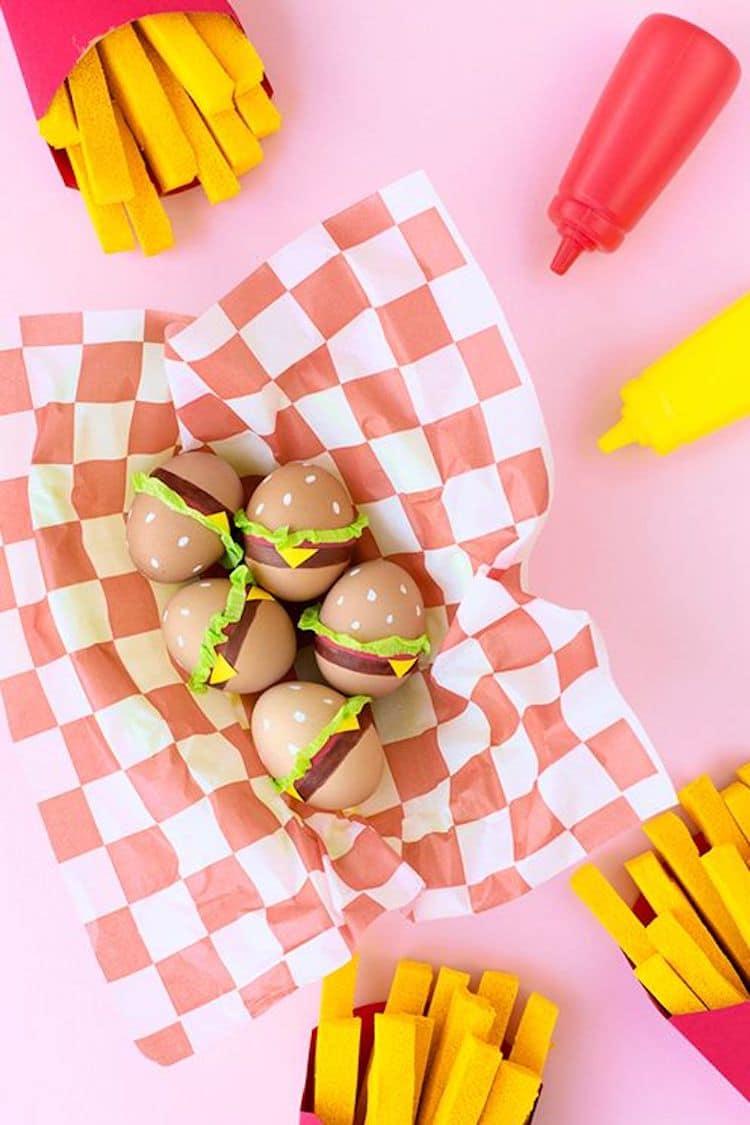 Κάντε μερικές τελείες στο επάνω μέρος του αυγού ώστε να μοιάζουν με τα σποράκια του burger bun. Στη συνέχεια, χρωματίστε μια στενή λωρίδα περιμετρικά του αυγού με καφέ χρώμα για να φτιάξετε το μπιφτέκι και μία με κόκκινο χρώμα για τη ντομάτα. Κόψτε δύο τρίγωνα από το κίτρινο χαρτόνι και κολλήστε τα πάνω στο αυγό για να μοιάζουν με λιωμένο cheddar. Τέλος, κολλήστε μια λωρίδα από το γκοφρέ πράσινο χαρτί πάνω από την ντομάτα για να φτιάξετε το μαρούλι. Καλή όρεξη!