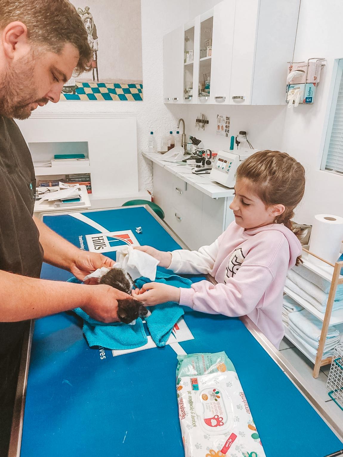Η Ιριάνα μου -που έχει εκφράσει την επιθυμία από τα 5 της χρόνια να γίνει κτηνίατρος- βίωσε κοντά τους μοναδικά συναισθήματα. Αγκάλιασε τη Ζωή, τη γατούλα που έχει χάσει το ένα της μάτι, τάισε το νεογέννητο γατάκι που κάποιος παράτησε το προηγούμενο βράδυ έξω από το κτηνιατρείο και έμαθε πως, ενώ μπορεί να υιοθετήθηκαν όλα τα γκρι γατάκια που βρίσκονται εκεί, το μαύρο γατάκι δεν το παίρνει κανείς, γιατί ακόμα και τώρα -το 2023- μερικοί το θεωρούν γρουσουζιά… Κατερίνα, Κώστα, σας ευχαριστώ. Η Ιριάνα δεν έχει σταματήσει να χαμογελάει από ευτυχία.
