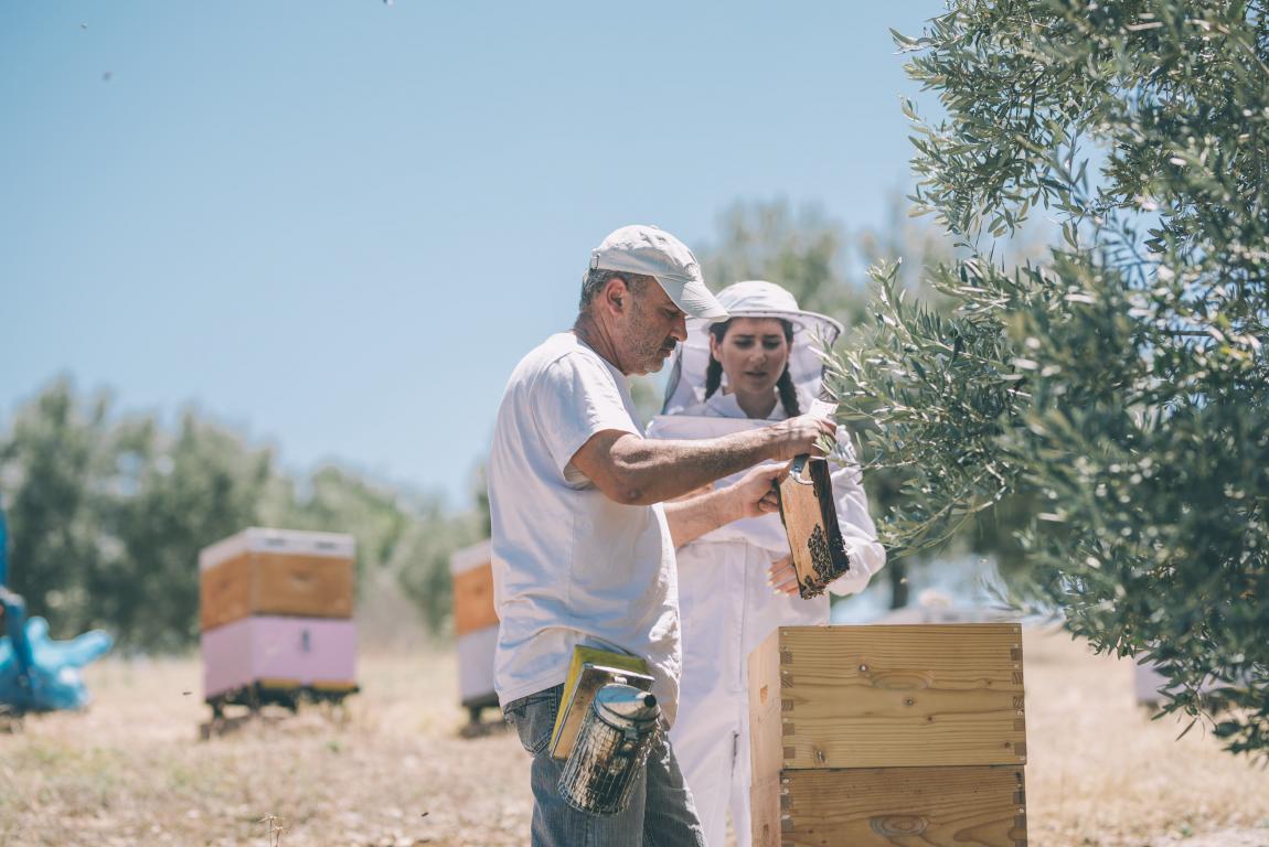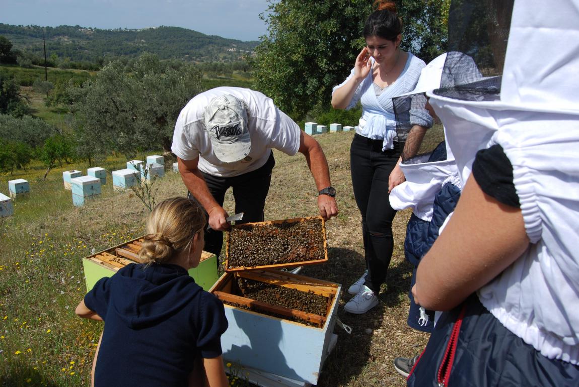 Μόλις φτάσετε στο μελισσοκομείο, το πρώτο πράγμα που θα σας εντυπωσιάσει θα είναι η μεγάλη σιδερένια πόρτα με εξάγωνα, που θυμίζει το σπίτι της μέλισσας! Στη συνέχεια θα συναντήσετε τις κυψέλες που υπάρχουν στο κτήμα ανάμεσα σε ελιές, χαρουπιές, ευκάλυπτα, και βότανα όπως ρίγανες, φασκόμηλα, δενδρολίβανα, θυμάρια, που είναι τροφή για τις μέλισσες.