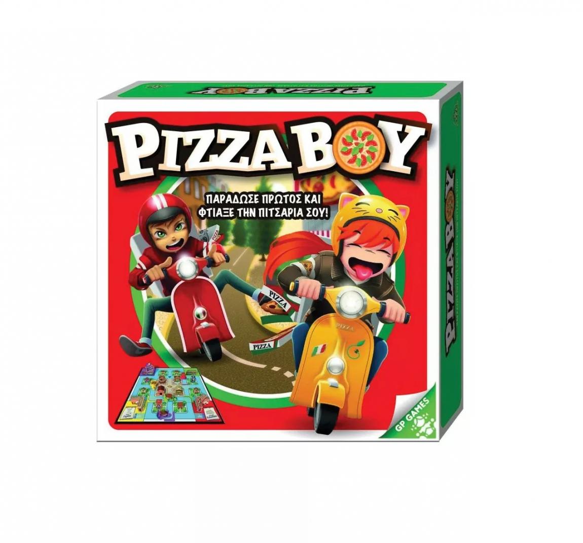 Επιτραπέζιο παιχνίδι Pizza Boy: Τα Σαββατοκύριακα είναι για φαγητό απ' έξω και επιτραπέζια παιχνίδια παρέα με όλη την οικογένεια! Το Pizza Boy είναι ένα παιχνίδι στρατηγικής και τύχης που θα λατρέψουν μικροί και μεγάλοι. Κάθε παίκτης έχει σαν αποστολή να παραδώσει τις παραγγελίες του περνώντας από τα στενά της πόλης. Οι αντίπαλοι όμως παραμονεύουν για να του βάλουν εμπόδια. Με κάθε παράδοση παραγγελίας οι παίκτες κερδίζουν χρήματα για να μεταφέρουν στην τράπεζα και να μεγαλώσουν την επιχείρησή τους. Στόχος; Να γίνεις το καλύτερο pizza boy! (Για 2-4 παίκτες από 4 ετών).