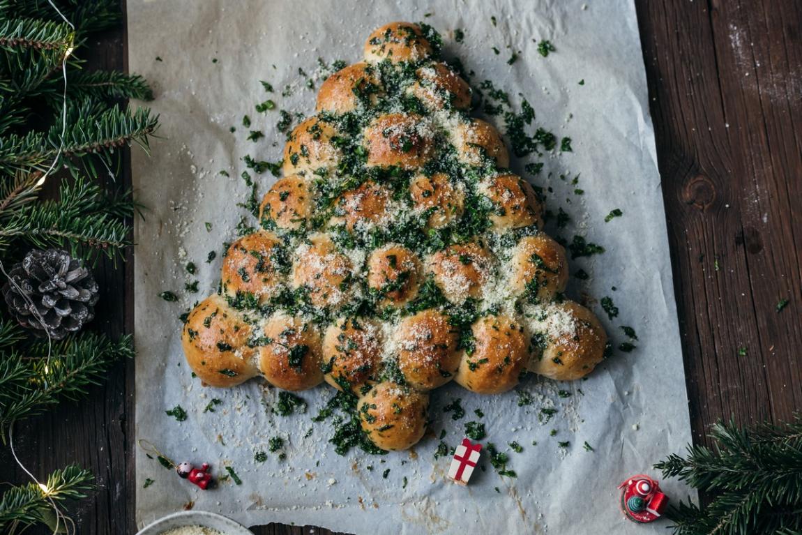 7. Μόλις βγει από τον φούρνο, πασπαλίζουμε το χριστουγεννιάτικο δέντρο με το μείγμα των μυρωδικών και φρεσκοτριμμένη παρμεζάνα.