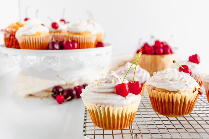 • Γαρνίρουμε τα κρύα muffins με τη βοήθεια του κορνέ και στολίζουμε με φρέσκα κεράσια.