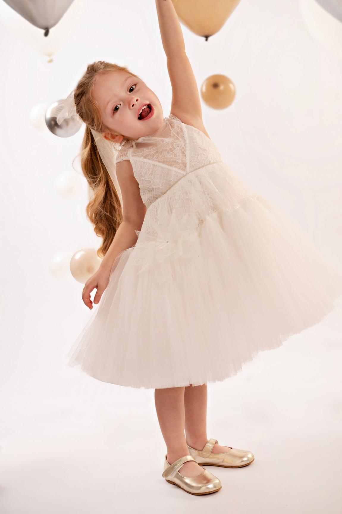Φόρεμα από λεπτό πουά κεντημένο τούλι, με διάφανες παγέτες, σουρωτή φούστα και λεπτομέρειες από γαλλική δαντέλα.