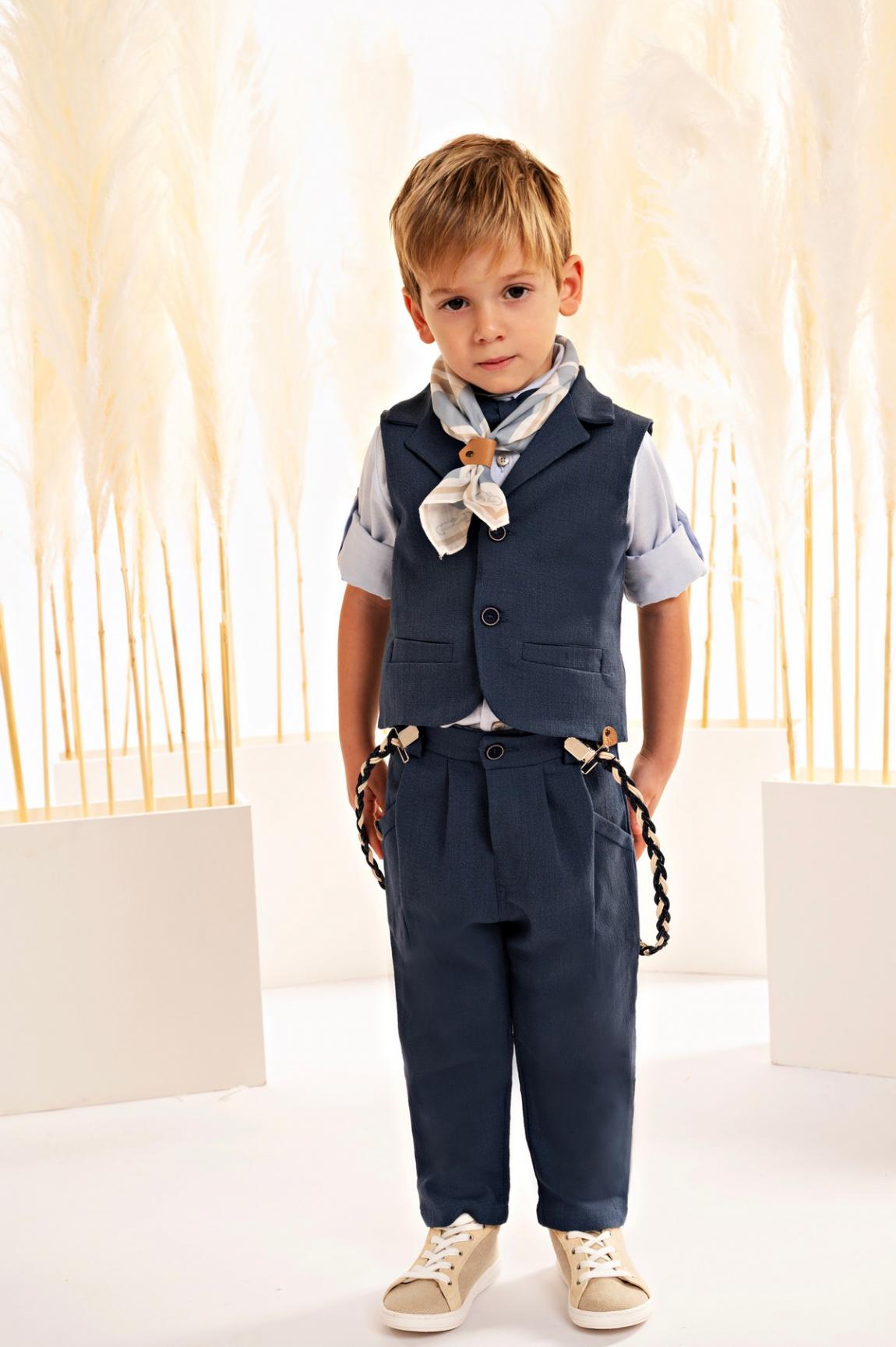 Σετ με δίπιετο παντελόνι, γιλέκο με πέτο, oxford πουκάμισο, παπιγιόν, personalized βουάλ φουλάρι και τιράντες.