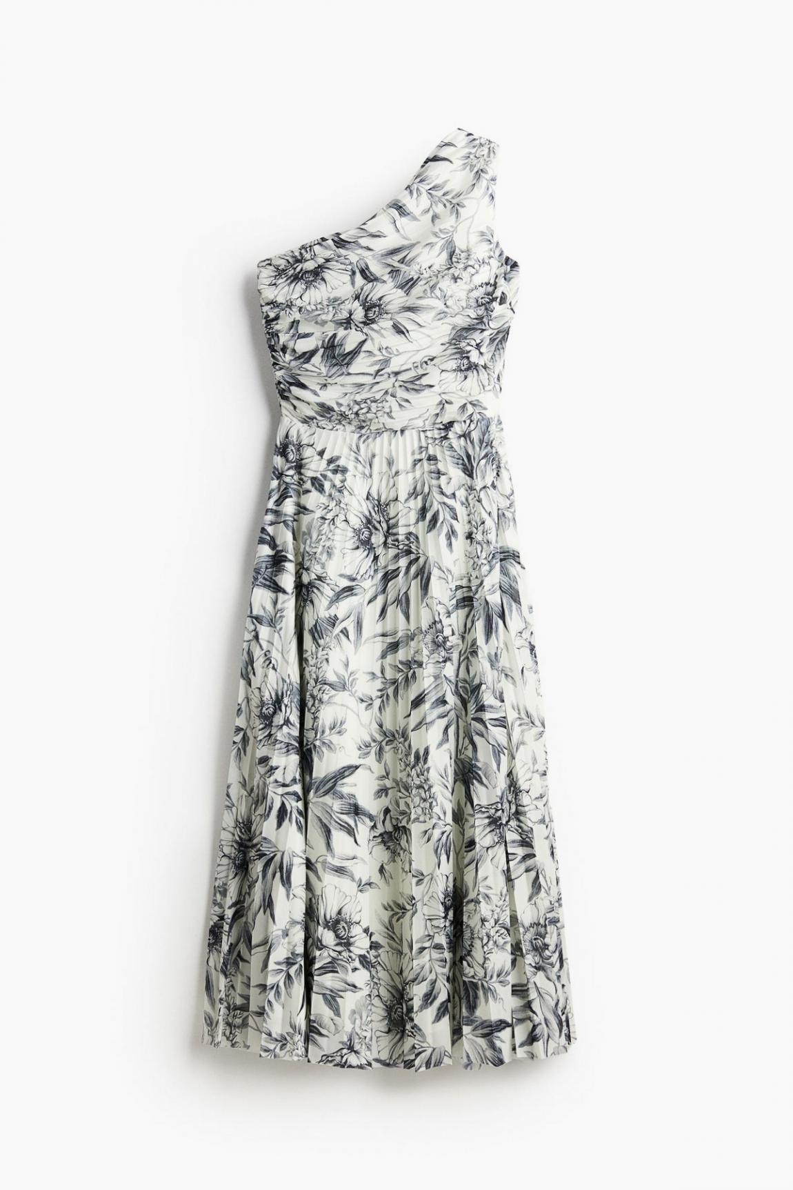 #5 Πλισέ φόρεμα με έναν ώμο, H&M: Όποια νονά λατρεύει τον ακαταμάχητο συνδυασμό του λευκού με το γκρι να σηκώσει το χέρι της! Μπορείτε να το συνδυάσετε με αξεσουάρ είτε σε χρυσό, είτε σε ασημί, είτε σε οποιοδήποτε funky χρώμα (π.χ. κίτρινο, μπλε ελεκτρίκ ή φούξια).