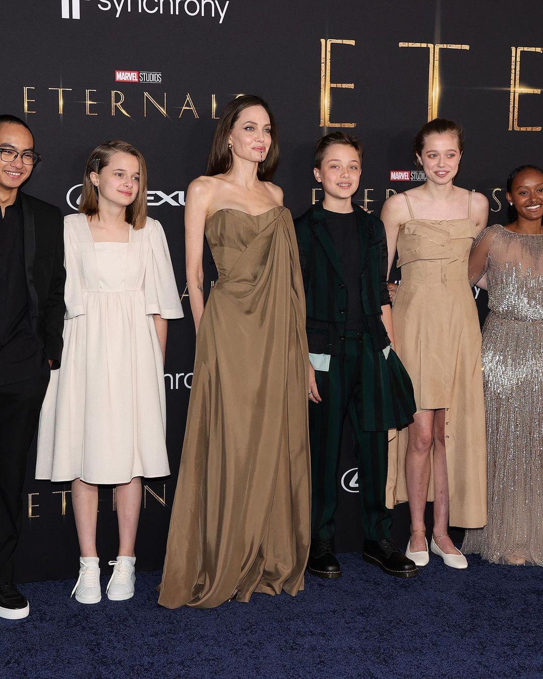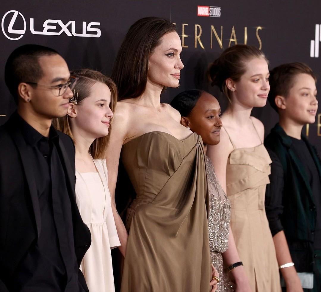 Η 46χρονη ηθοποιός πόζαρε στο κόκκινο χαλί του Dolby Theatre μαζί με τον 20χρονο Maddox, την 16χρονη Zahara, την 15χρονη Shiloh και τα 13χρονα δίδυμα, Vivienne και Knox. Από την εκδήλωση, ωστόσο, απουσίαζε ο 17χρονος Pax.