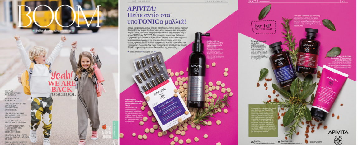 Boom note: Επισκεφτείτε το Nature's Hair Studio στον 3ο όροφο του The APIVITA Experience Store, το πρώτο πράσινο κομμωτήριο στην Αθήνα, για μια τονωτική θεραπεία μαλλιών από τους εξειδικευμένους hair stylists. Απολαύστε το τονωτικό μασάζ με το λάδιNature’s Hair Miracle που θρέφει και δυναμώνει τα μαλλιά, χαρίζοντας υγεία και ζωντάνια. Η περιποίηση γίνεται με τα προϊόντα της σειράςTONICκαι ολοκληρώνεται με τη λοσιόν κατά της τριχόπτωσης για ενδυνάμωση και όγκο.