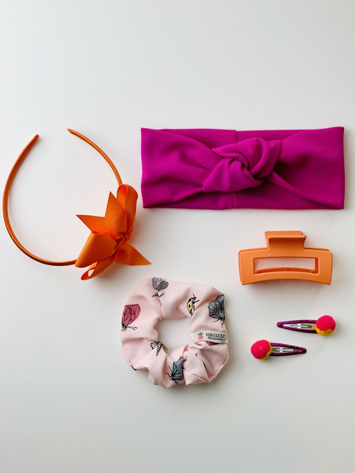 1. Orange Bow Hairband 2. Bright Orange Clip 3. Ladybug Scrunchie 4.Hybrid Fuchsia Knot Headband