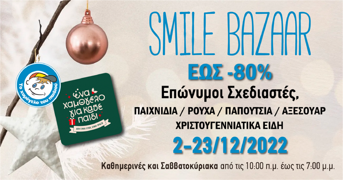 Με μεγάλη χαρά και φέτος «Το Χαμόγελο του Παιδιού» προσκαλεί μικρούς και μεγάλους στο Χριστουγεννιάτικο Smile Bazaar, το οποίο πραγματοποιείται από 2  έως 23 Δεκεμβρίου 2022, με δωρεάν είσοδο στους χώρους του Οργανισμού «Το Χαμόγελο του Παιδιού», Γαρυττού 80, Αγία Παρασκευή, 5ος όροφος (πλησίον μετρό Αγ. Παρασκευής).