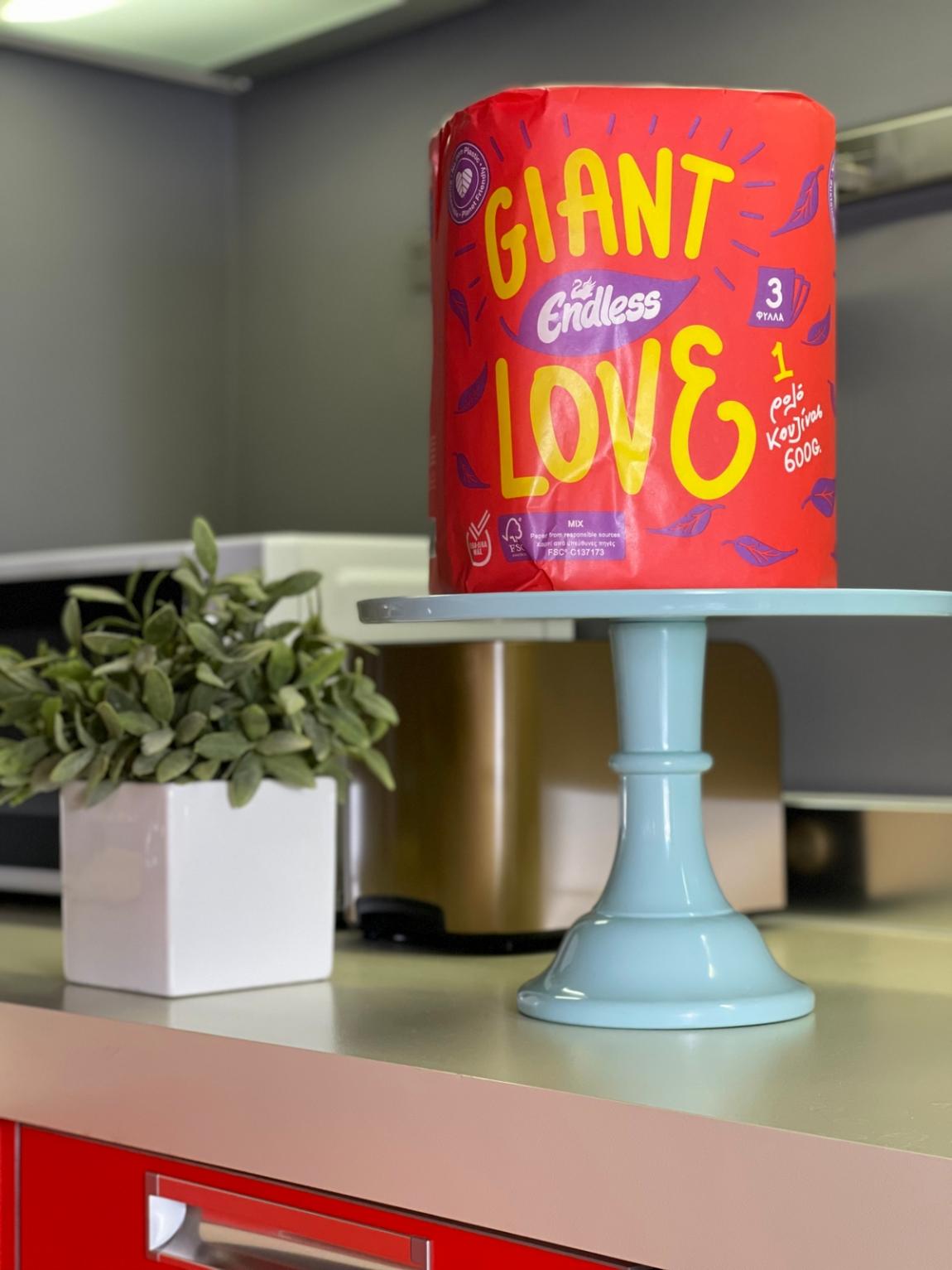Giant Love: Η αγάπη έχει πολλές μορφές, σωστά; Αυτό το χαρτί κουζίνας είναι έρωτας με την πρώτη ματιά, και μάλιστα γιγάντιος! Το ρολό κουζίνας Giant Love είναι ένα στολίδι για τον πάγκο σας! Από 100% καθαρή κυτταρίνη, αντέχει, απορροφά και φυσικά, κάνει καλό στο περιβάλλον καθώς μπορείτε (και πρέπει) να ανακυκλώσετε τη χάρτινη συσκευασία του!