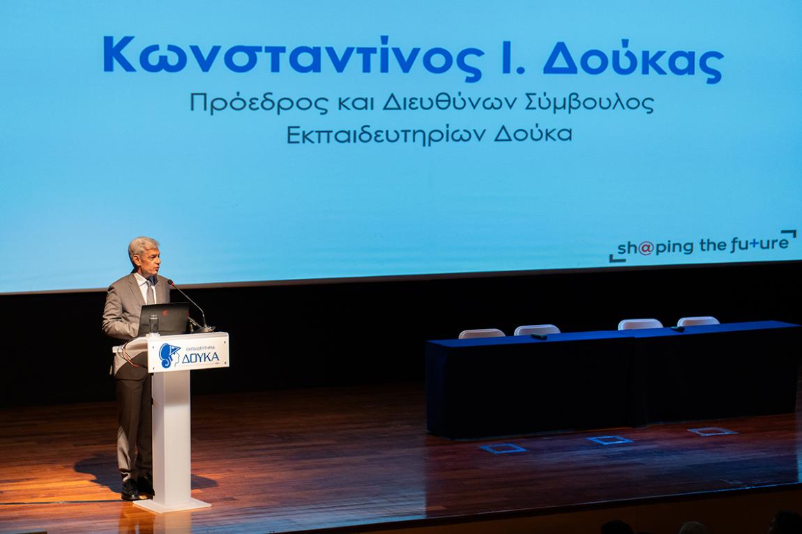 Κηρύσσοντας την έναρξη της Ημερίδας, ο Προέδρος και Διευθύνων Σύμβουλος των Εκπαιδευτηρίων Δούκα κος Κωνσταντίνος Ι. Δούκας υπογράμμισε την ανάγκη της συνεργασίας μεταξύ φορέων, σχολείων και οικογενειών τονίζοντας ότι «η παροιμία ‘Αν θες να πας γρήγορα, πήγαινε μόνος. Αν θες να πας μακριά, πήγαινε με άλλους’, στη σημερινή εποχή, σημασιοδοτείται ως ο συνδυασμός των δύο προτροπών. Σήμερα, χρειάζονται συνεργασίες που θα κινήσουν τις διαδικασίες για να πάμε πιο γρήγορα και πιο μακριά μαζί».
