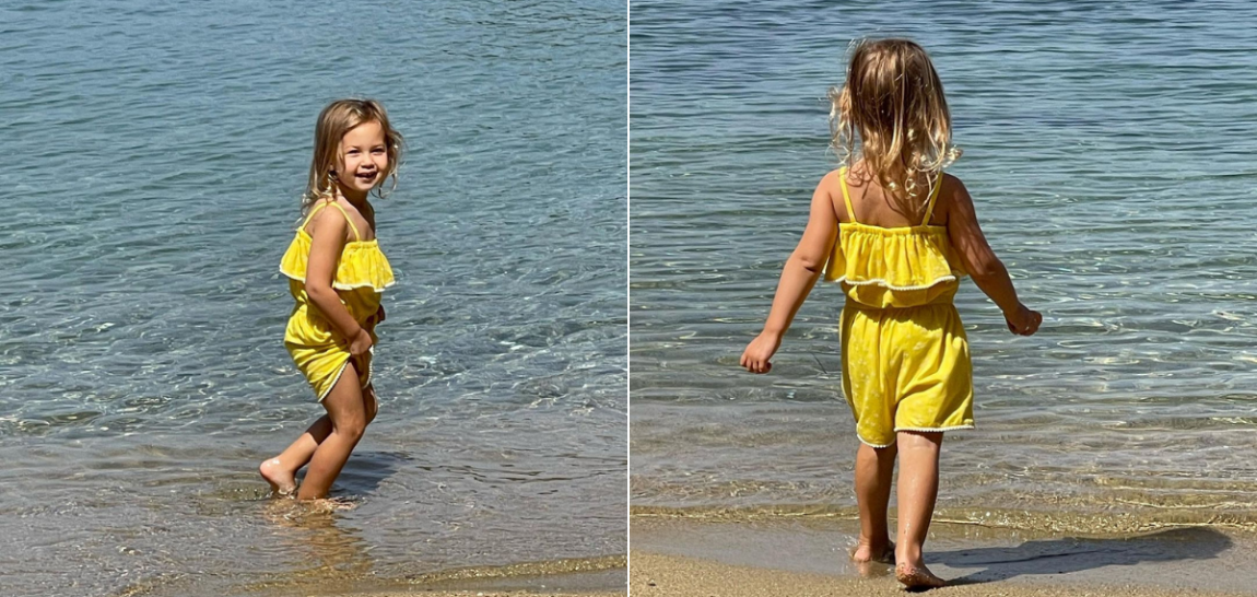 Ο προσωπικός λογαριασμός της ηθοποιού στο Instagram έχει γεμίσει δημοσιεύσεις με άρωμα Ελλάδας, όμως το post που έκλεψε την παράσταση είναι εκείνο με τις φωτογραφίες της 2,5 ετών κορούλας της, Rani, η οποία φορά το κίτρινο μαγιό της και παίζει με το νερό σε κάποια από τις παραλίες του νησιού.