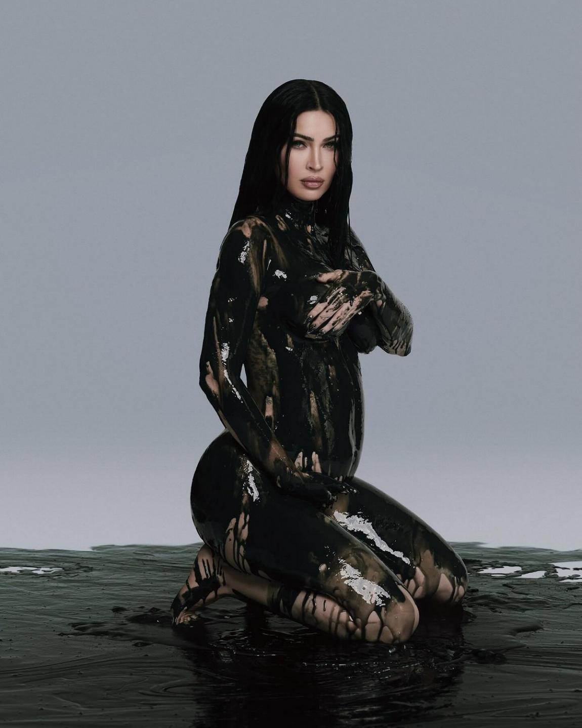Στην πρώτη λήψη βλέπουμε τη Megan Fox να ακουμπά το ένα χέρι στη φουσκωμένη κοιλίτσα της και το άλλο στο στήθος της, ενώ το σώμα της είναι καλυμμένο με μαύρο υγρό. Στο δεύτερο click που έχει μοιραστεί η star, φαίνεται το θετικό τεστ εγκυμοσύνης.