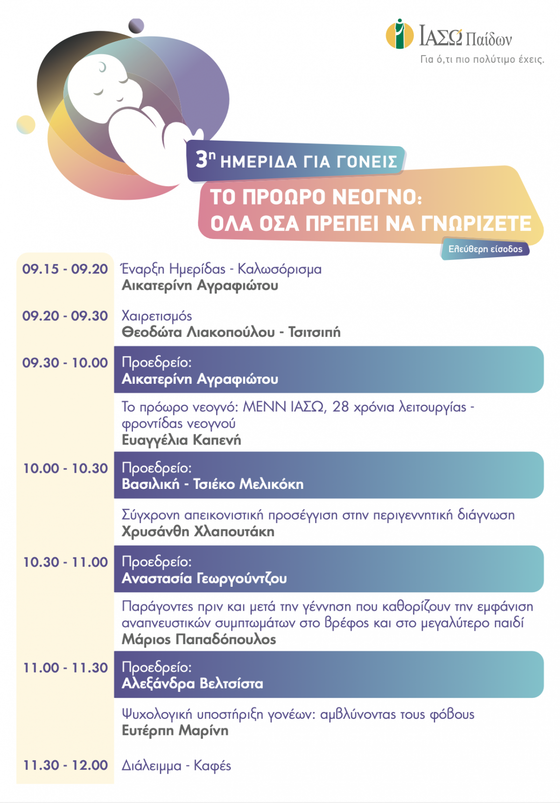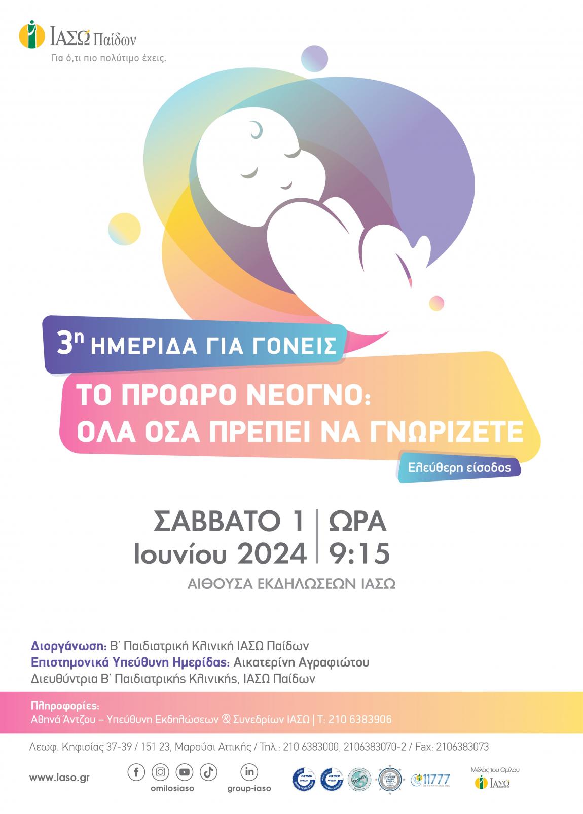 Η 3η Ημερίδα για Γονείς του ΙΑΣΩ Παίδων με θέμα «Το Πρόωρο Νεογνό: Όλα όσα πρέπει να γνωρίζετε», θα πραγματοποιηθεί το Σάββατο 01 Ιουνίου 2024, στις 09:15, στην Αίθουσα Εκδηλώσεων του ΙΑΣΩ.
