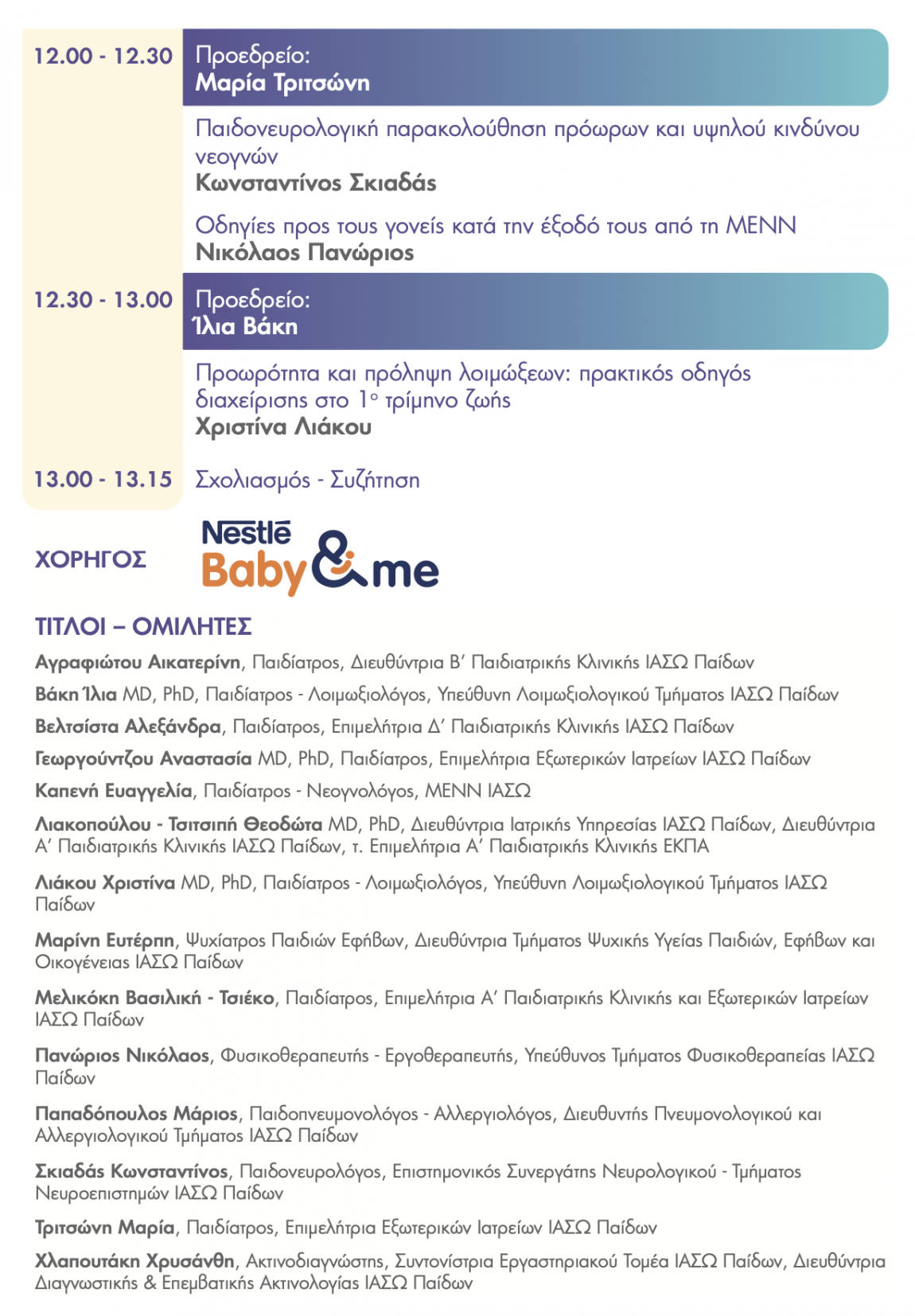 Η ημερίδα θα ξεκινήσει με την παρουσίαση της Μονάδας Εντατικής Νοσηλείας Νεογνών του ΙΑΣΩ, ενώ θα γίνει αναφορά στη φροντίδα του πρόωρου νεογνού. Στη συνέχεια, ιδιαίτερη έμφαση θα δοθεί στη σύγχρονη απεικονιστική προσέγγιση στην περιγεννητική διάγνωση, στους παράγοντες πριν και μετά τη γέννηση που καθορίζουν την εμφάνιση αναπνευστικών συμπτωμάτων, στην πρόληψη λοιμώξεων κατά τη διάρκεια του 1ου τριμήνου ζωής, αλλά και στην παιδονευρολογική παρακολούθηση των βρεφών υψηλού κινδύνου. Τέλος, εκτενής αναφορά θα γίνει στη ψυχολογική υποστήριξη των γονέων.