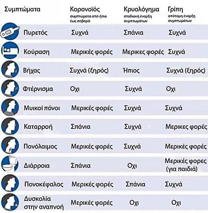 Στον παρακάτω Πίνακα (WHO, CDC), φαίνονται οι βασικές διαφορές όσον αφορά τα κυριότερα συμπτώματα που χαρακτηρίζουν την κάθε οντότητα.