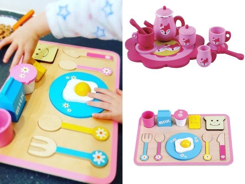 Σετ τσαγιού και σετ πρωινού της εταιρείας JUMINI. Το τσάι είναι ζεστό και το πρωινό έτοιμο στον δίσκο! Παρακαλούνται όλα τα κουκλάκια να περάσουν στην τραπεζαρία για να σερβιριστούν! Όλα τα σετ (κουτάλια, μαχαιροπήρουνα, πιάτο, αβγό, ψωμί, τυρί, μέλι, γάλα, κούπες) είναι κατασκευασμένα από εκλεκτό ξύλο, και αποτελούν ιδανική αφορμή για ένα φανταστικό παιχνίδι ρόλων!
