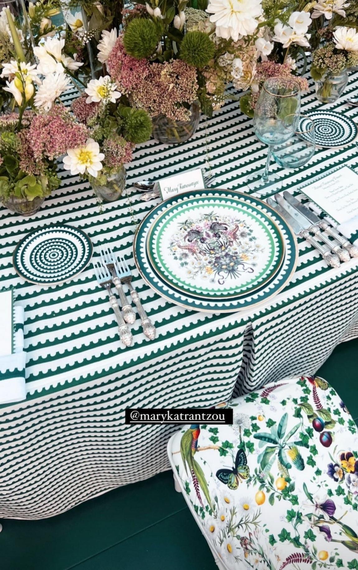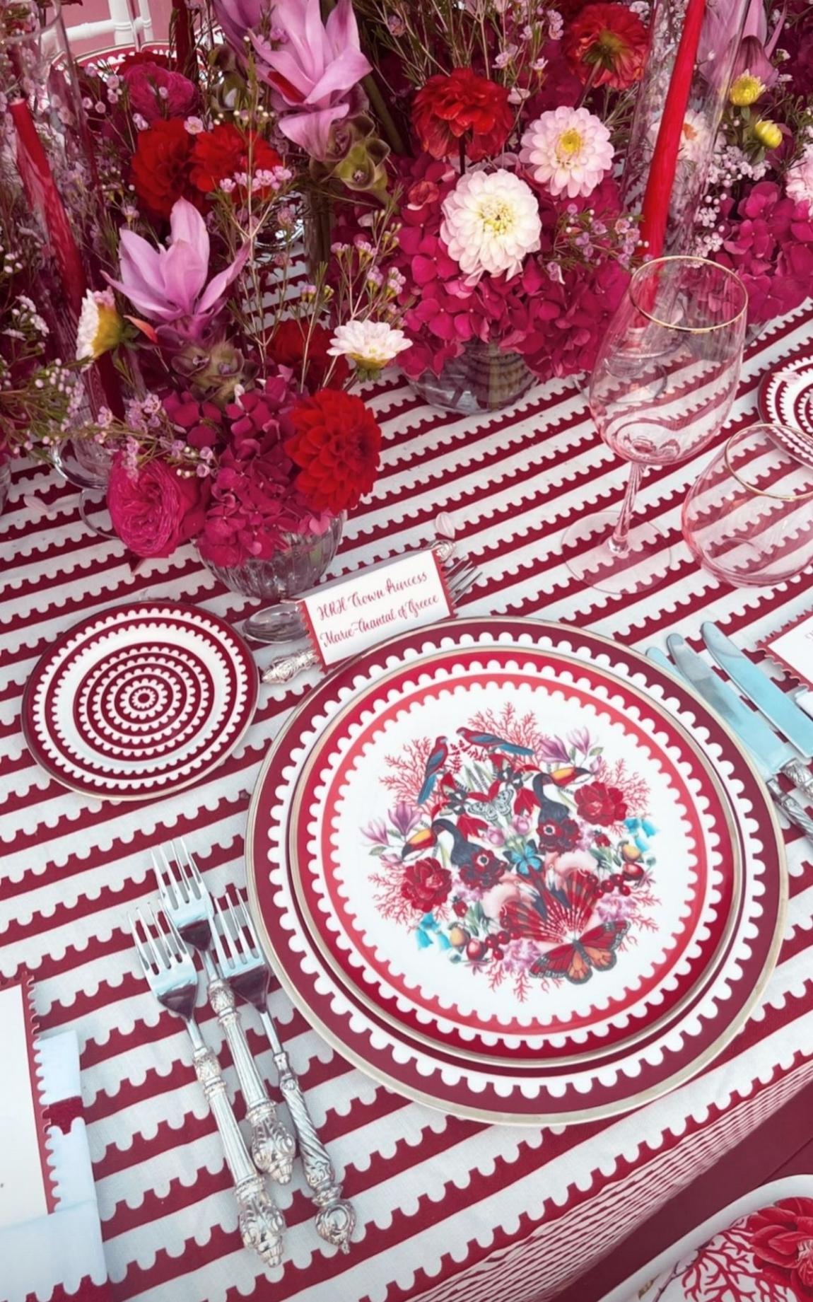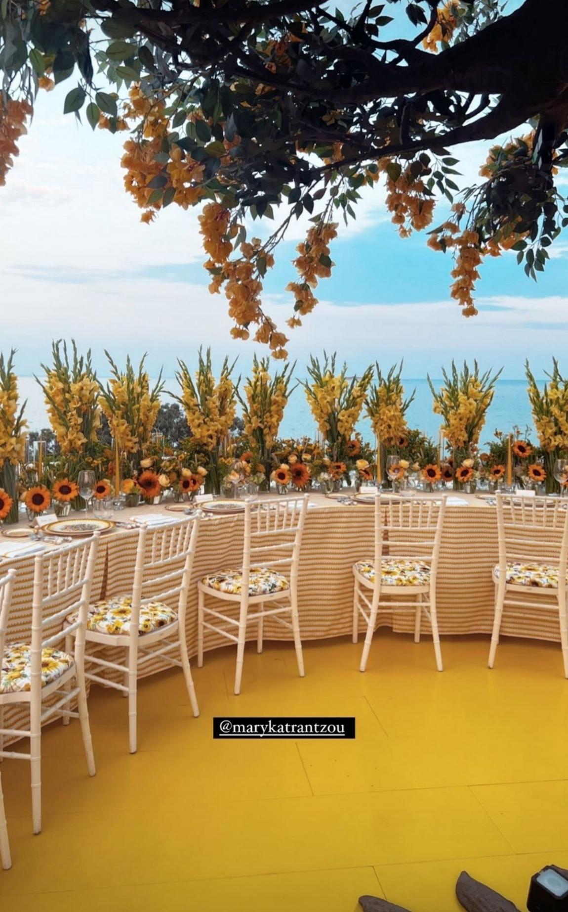 Αμέσως μετά το μυστήριο ακολούθησε δεξίωση σε ένα ειδυλλιακό μέρος με απίστευτη θέα στη θάλασσα. Η διακόσμηση με τα τέσσερα ανθοστολισμένα τραπέζια σε κόκκινες, κίτρινες, πράσινες και μπλε αποχρώσεις, αλλά και το tableware με τα signature patterns της σχεδιάστριας δημιούργησαν το απόλυτο σκηνικό για την πιο ευτυχισμένη ημέρα της οικογένειας.