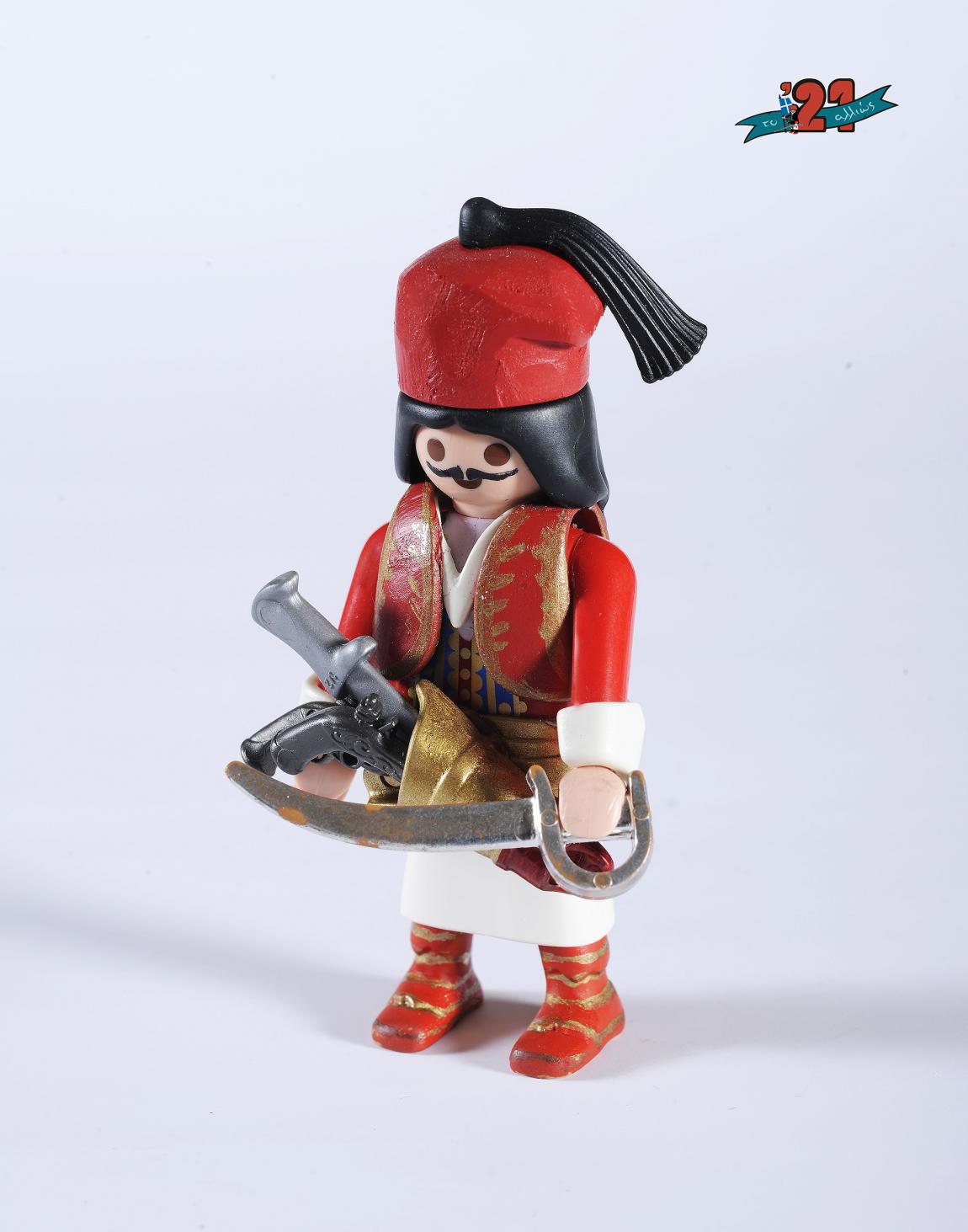 Ο Αλέξανδρος Υψηλάντης, η Μπουμπουλίνα, ο Κολοκοτρώνης, ο Καραϊσκάκης και άλλοι ήρωες της Ελληνικής Επανάστασης αποδίδονται σε φιγούρες της PLAYMOBIL και μας “συστήνονται” με τα βιογραφικά τους, ενώ κρίσιμα γεγονότα της περιόδου, όπως ο όρκος της Φιλικής Εταιρείας, η κήρυξη της Επανάστασης και η δολοφονία του Καποδίστρια αναπαριστώνται μέσα από τρισδιάστατες κατασκευές (διοράματα) με φιγούρες και εξαρτήματα PLAYMOBIL.
