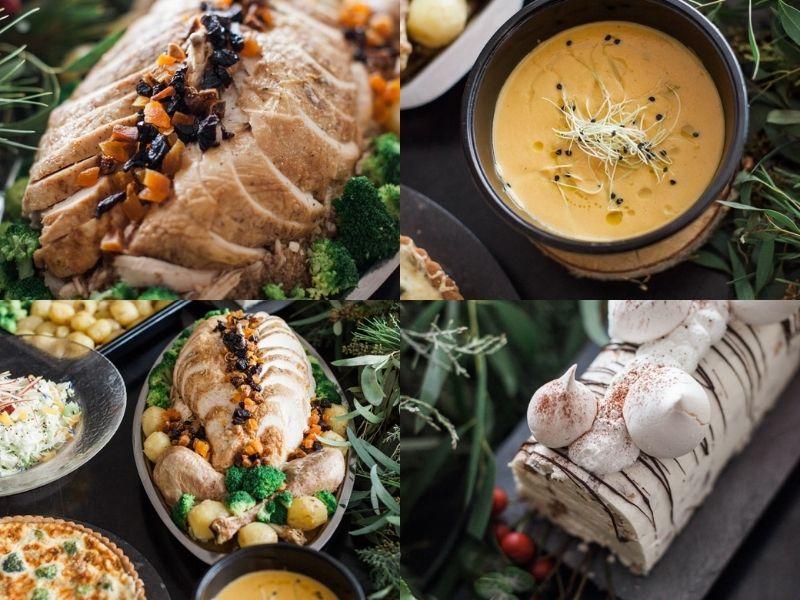 - Κυρίως πιάτο: Γαλοπούλα με παραδοσιακή Χριστουγεννιάτικη γέμιση (συνοδεύεται με πατάτες βουτύρου, μπρόκολο, αποξηραμένα βερίκοκα, δαμάσκηνα & σταφίδες)