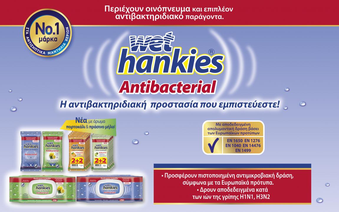 Τώρα, εκτός από άρωμα καθαριότητας και άρωμα φρεσκάδας λεμονιού, τα Wet Hankies Antibacterial είναι διαθέσιμα και σε νέα αρώματα, όπως πορτοκάλι και πράσινο μήλο. Οι μεγάλες συσκευασίες είναι ιδανικές για το σπίτι ή για χώρους όπου περνάτε πολλές ώρες, ενώ οι travel size συσκευασίες σάς λύνουν τα χέρια όταν βρίσκεστε εκτός. Βάζοντας ένα πακέτο στην τσάντα σας αλλά και στη σχολική τσάντα του παιδιού σας έχετε πάντα μαζί σας την αντιβακτηριδιακή προστασία που εμπιστεύεστε