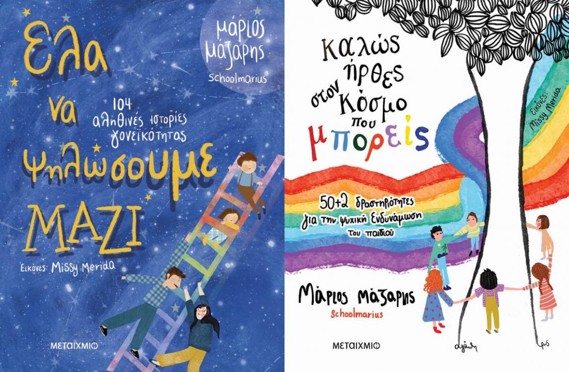 Τα κριτήρια ήταν βιωματικά, ποιες δράσεις μέσα στα χρόνια ένιωσα ότι βοήθησαν περισσότερο την ομάδα να δεθεί, το σύνολο των παιδιών να γίνουν ομάδα και να εξερευνήσουν τον εαυτό τους, τις κλίσεις, τον ψυχισμό τους. Με ενδιαφέρει οτιδήποτε μοιράζομαι, είτε δωρεάν είτε όχι, να είναι χρήσιμο, και για να είναι χρήσιμο πρέπει να το έχω χρησιμοποιήσει εγώ πρώτα, να ξέρω πού με οδήγησε και να ενθουσιαστώ. Το «Καλώς ήρθες στον κόσμο που μπορείς» είναι ένα βιβλίο που με ενθουσιάζει, δεν υπήρχε τίποτα αντίστοιχο στην ελληνική βιβλιογραφία και πίστευα πάρα πολύ ότι θα βοηθήσει χιλιάδες τάξεις και σπίτια, όπως το κάνει. Το «Έλα να ψηλώσουμε μαζί», από την άλλη, είναι χρήσιμο υπό άλλο πρίσμα. Περιλαμβάνει 104 αληθινές ιστορίες που αφορούν σχεδόν το σύνολο των θεμάτων της ελληνικής κοινωνίας με μια προσέγγιση γονεϊκότητας, όπως γονείς είμαστε όλοι πρωτίστως του παιδιού μέσα μας. Είναι ένα βιβλίο που δεν κουνάει το δάχτυλο, αντιθέτως σου δίνει το χέρι, εξού και το «Έλα» στον τίτλο, και τονίζει ότι όλα έχουν πολλές πλευρές στη ζωή, επομένως δεν χωράνε σωστά και λάθη και τύψεις, όλοι μπορούμε να ψηλώσουμε μαζί.