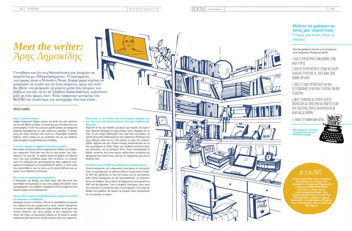 Γεννήθηκε και ζει στη Θεσσαλονίκη και λατρεύει να ασχολείται με «Μικροπράγματα». Ο αγαπημένος του ήρωας είναι ο Ντόναλντ Ντακ. Καμιά φορά εύχεται να μπορούσε να πετάει και να ήταν αόρατος, όμως πιο πολύ θα ήθελε «να μπορούσε να μπαίνει μέσα στις ιστορίες των βιβλίων του και να ζει στ’ αλήθεια διασκεδαστικές περιπέτειες μαζί με τους ήρωές του». Ένας «αόρατος» ρεπόρτερ του BOOM συνάντησε τον δημοσιογράφο και συγγραφέα Άρη Δημοκίδη και κατέγραψε όλα όσα είπαν...