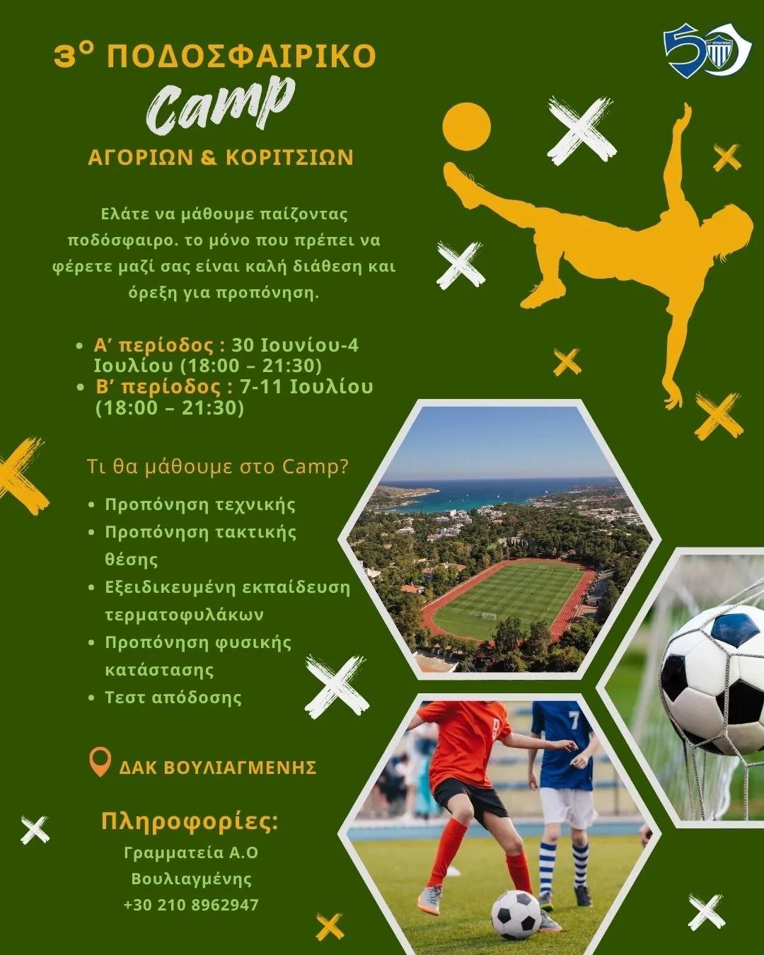 Οι μικροί ποδοσφαιριστές των νοτίων προαστίων, κορίτσια και αγόρια, θα είναι στο στοιχείο τους στο 3ο ποδοσφαιρικό camp του Αθλητικού Ομίλου Βουλιαγμένης, που καλύπτει δύο περιόδους (30/06 – 04/07, 07/07 – 11/07). Προσφέρει σε παιδιά ηλικίας 5 έως 15 ετών βιωματικές δράσεις και ψυχαγωγία, με γνωστούς ποδοσφαιριστές πρώτης κατηγορίας, πλήρως καταρτισμένους αθλιάτρους, ψυχολόγους και διατροφολόγους να δίνουν το «παρών». Πάντα, φυσικά, με τη στρογγυλή θεά στο επίκεντρο! www.aovouliagmenis.gr (www.aovouliagmenis.gr/soccer/3o-podosfairiko-camp-agorion-kai-koritsion2025/)
