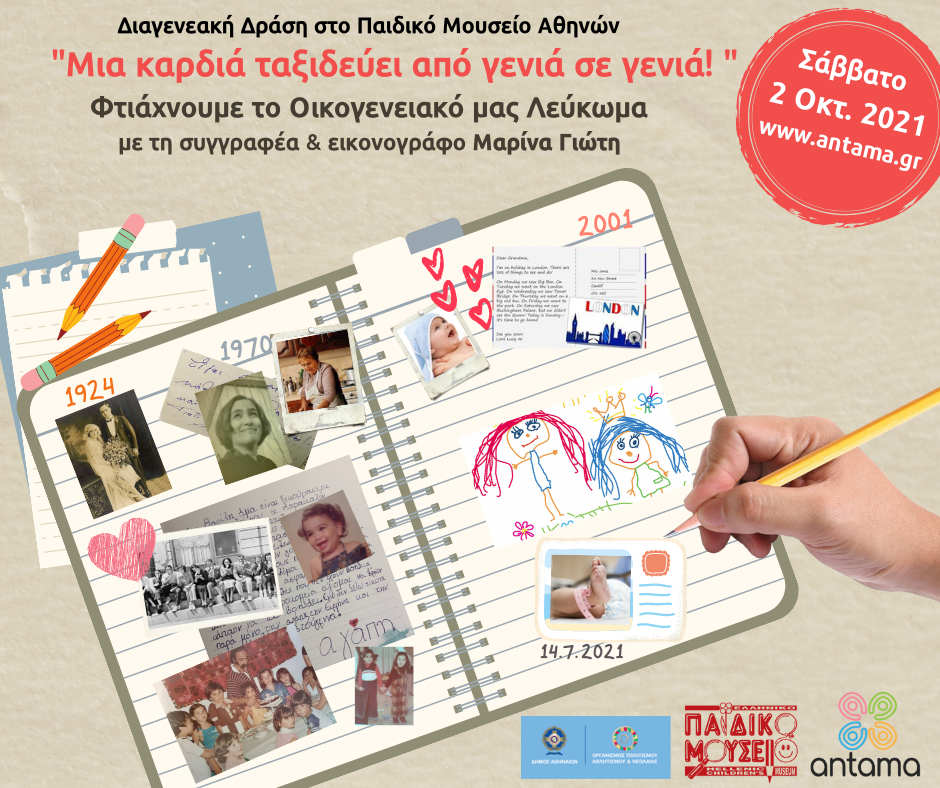 Με αφορμή την «Παγκόσμια Ημέρα των ηλικιακά Μεγαλύτερων Ανθρώπων» (1η Οκτωβρίου), η «ΑΝΤΑΜΑ» και το «Ελληνικό Παιδικό Μουσείο» προσκαλούν στο έκθεμα ΣΟΦΙΤΑ του Παιδικού Μουσείου της Αθήνας, το Σάββατο 2 Οκτωβρίου, Μικρούς (4-12 χρόνων) και μεγάλους, να συμμετάσχουν ΜΑΖΙ στη διαγενεακή δράση «Μια καρδιά ταξιδεύει από γενιά σε γενιά» με τη συγγραφέα και εικονογράφο Μαρίνα Γιώτη.