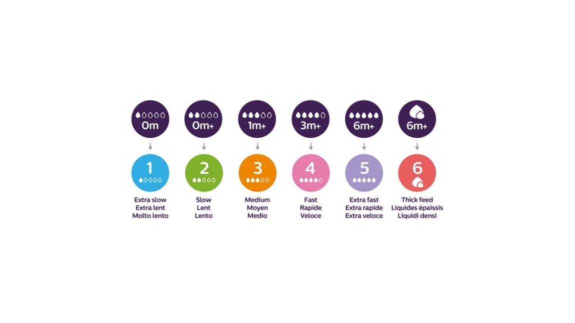- Δεν βασίζεται πλέον μόνο στην ηλικία, γιατί η ηλικία δεν είναι πάντα το απόλυτο κριτήριο επιλογής θηλής! Αντί για μήνες, χρησιμοποιείται ένδειξη αριθμών (1-6) και ρυθμού ροής (αργός, μεσαίος, γρήγορος).