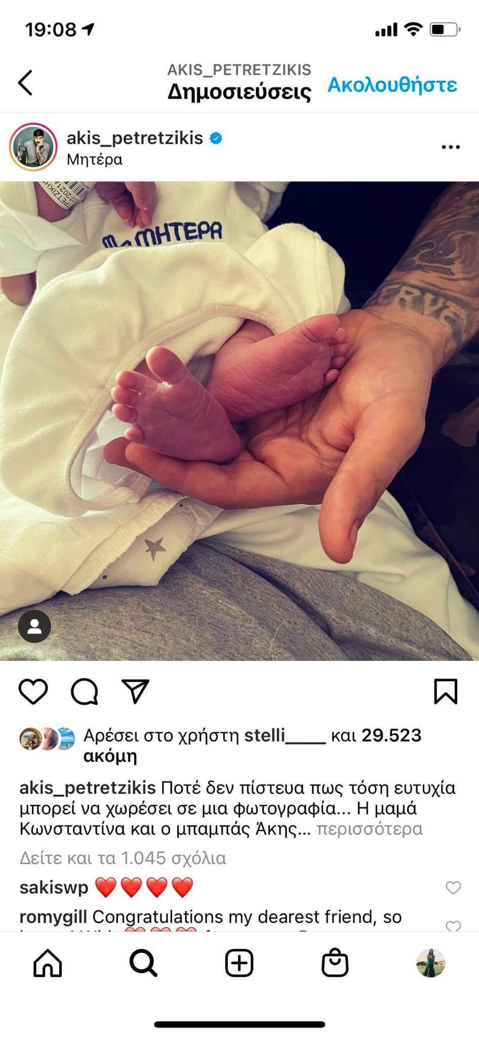 Την ανακοίνωση έκανε ο ίδιος ο περήφανος μπαμπάς με ανάρτησή του στο Instagram, όπου δημοσίευσε μια τρυφερή φωτογραφία με το πατουσάκι του μωρού κι έγραψε: "Ποτέ δεν πίστευα πως τόση ευτυχία μπορεί να χωρέσει σε μια φωτογραφία... Η μαμά Κωνσταντίνα και ο μπαμπάς Άκης σήμερα ζουν την καλύτερη μέρα της ζωής τους!"