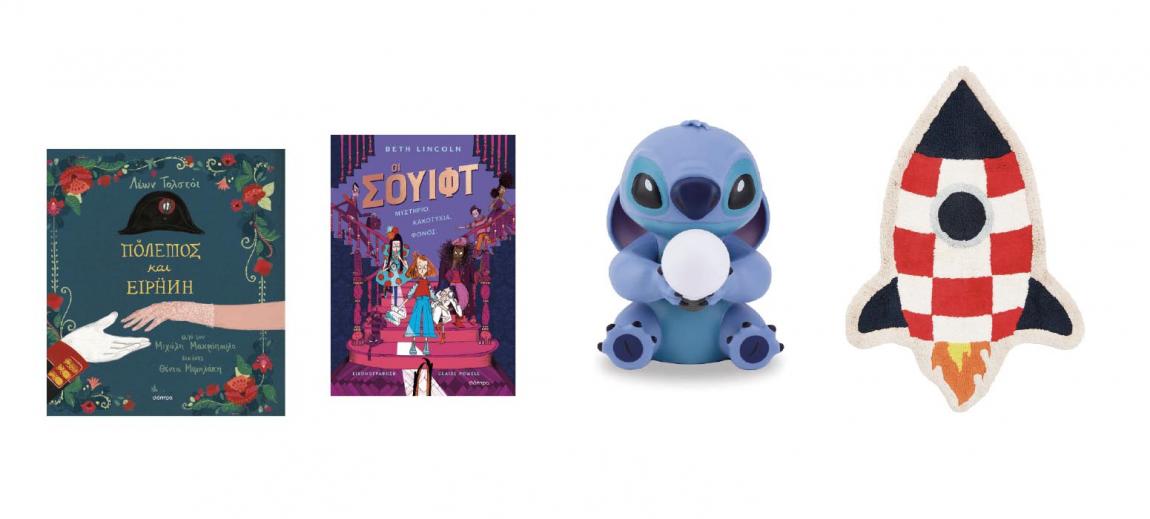 «Πόλεμος και Ειρήνη» του Leo Tolstoy, σε διασκευή του Μιχάλη Μακρόπουλου για παιδιά, Εκδόσεις ΔΙΟΠΤΡΑ, www.dioptra.gr | «Oι Σουίφτ» της Beth Lincoln, Εκδόσεις ΔΙΟΠΤΡΑ, www.dioptra.gr | Φωτιστικό Stitch Light Home, Disney Classics, Paladone | Φουντωτό χαλί σε σχήμα πυραύλου, H&M, www.hm.com