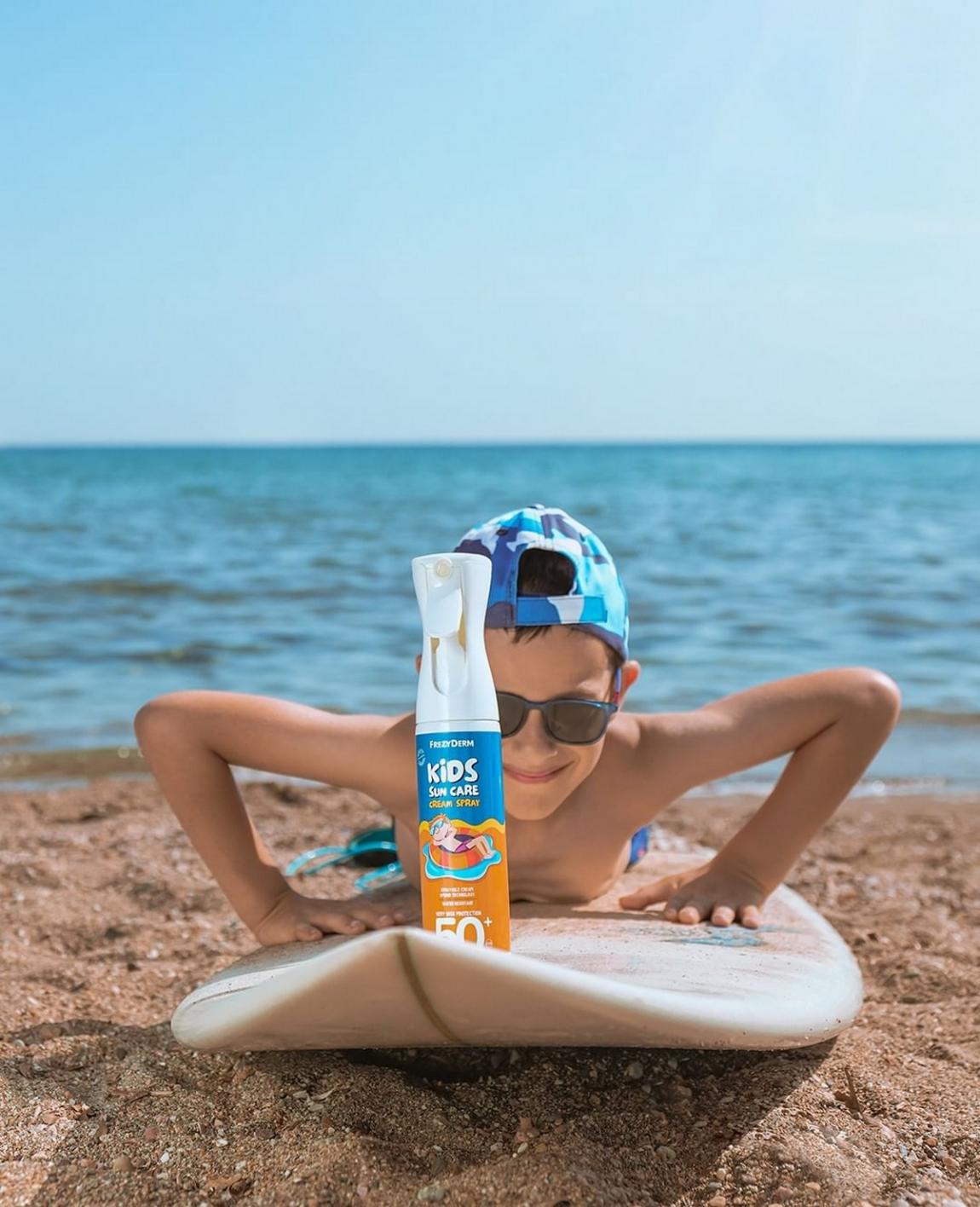 Το νέο παιδικό αντηλιακό Kids Sun Care Cream Spray SPF 50+ για πρόσωπο και σώμα, παρέχει πολύ υψηλή ηλιοπροστασία σε μορφή ψεκάσιμης κρέμας, με ενυδατικές και περιποιητικές ιδιότητες. Με ειδική αντλία στοχευμένου ψεκασμού και με νέα υβριδική τεχνολογία που μετατρέπει την κρέμα σε μικροσταγονίδια για ομοιόμορφη και ταχύτερη εφαρμογή, χωρίς να κυλά το προϊόν στο δέρμα. Ιδανικό και για φωτοευαίσθητα δέρματα.
