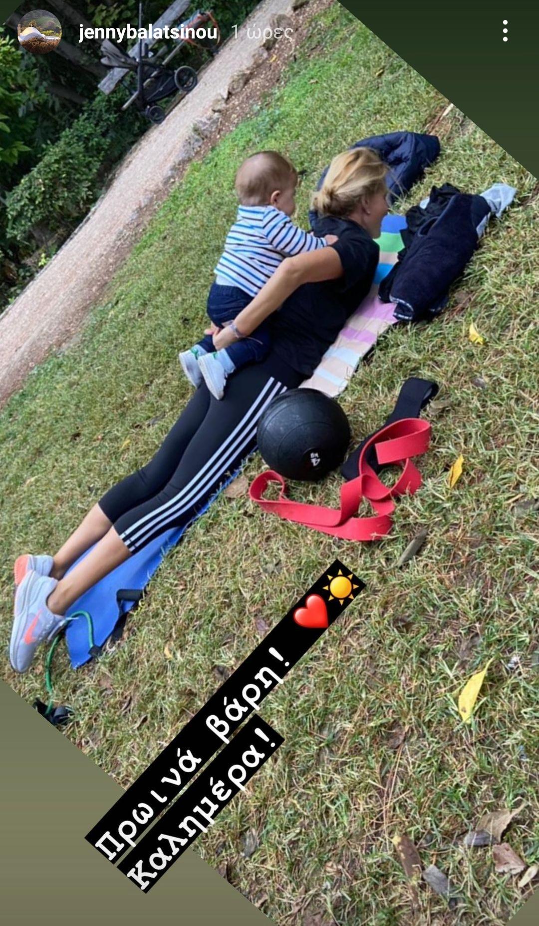 Φορώντας αθλητικά ρούχα και έχοντας μαζί όλα τα απαραίτητα για τη γυμναστική της, η Τζένη Μπαλατσινού έχει ξαπλώσει μπρούμυτα έχοντας στην πλάτη της τον 10 μηνών γιο της, που απέκτησε με τον σύζυγό της Βασίλη Κικίλια.
