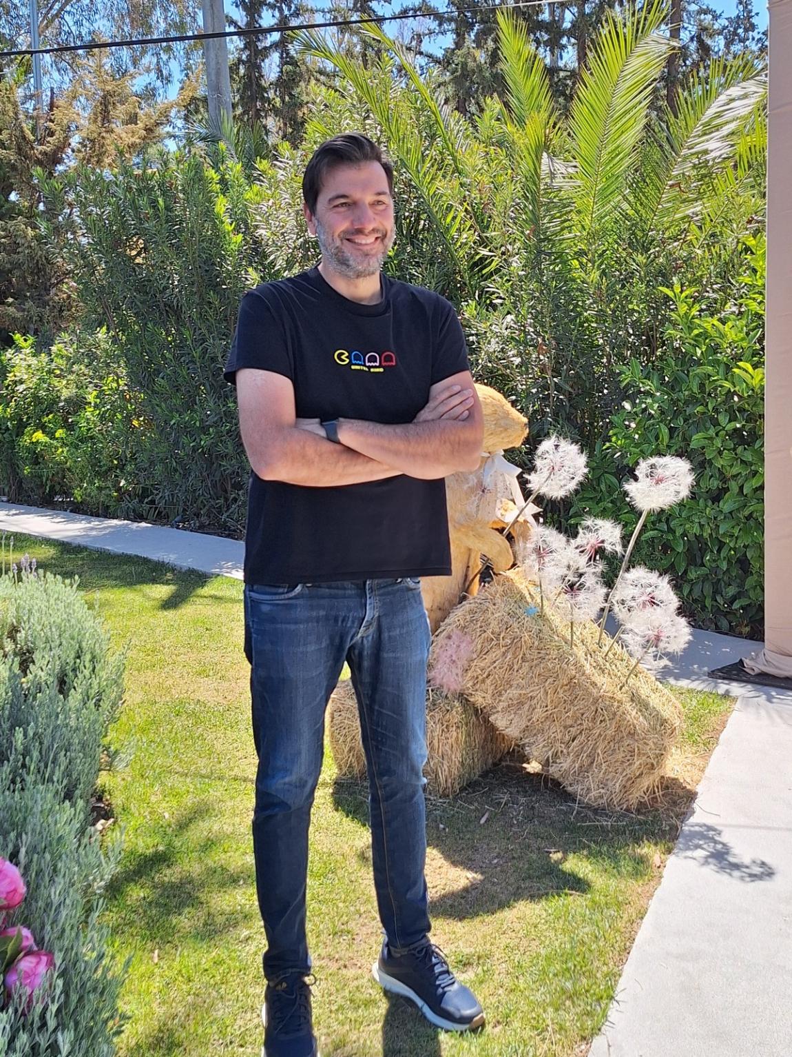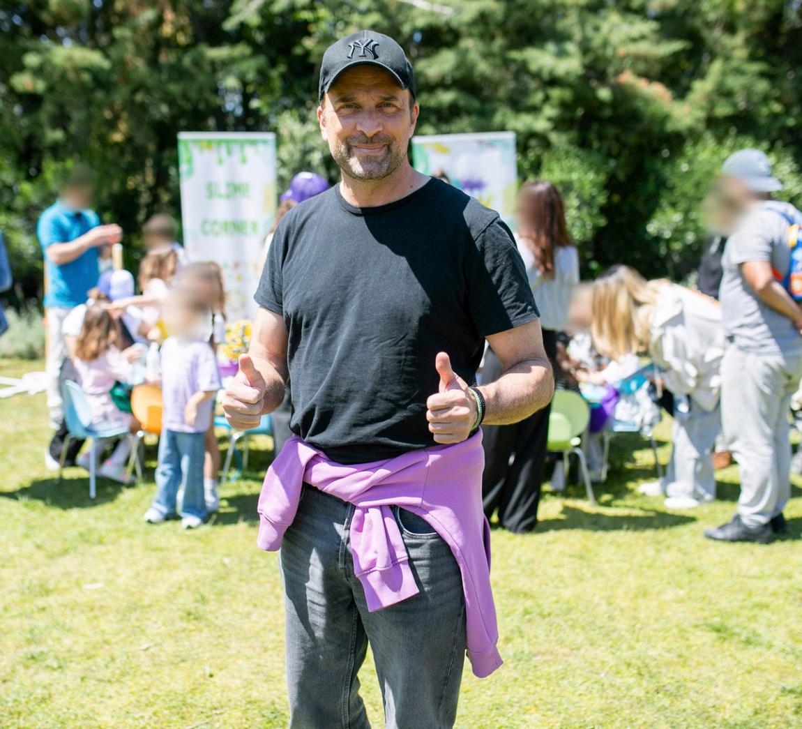 Χαλαρός και αυθόρμητος, ο παρουσιαστής πόζαρε στον φωτογραφικό φακό, ενώ λίγο πιο πέρα η σύζυγός του, Κωνσταντίνα Καραλέξη, απολάμβανε το παιχνίδι με την κόρη τους.