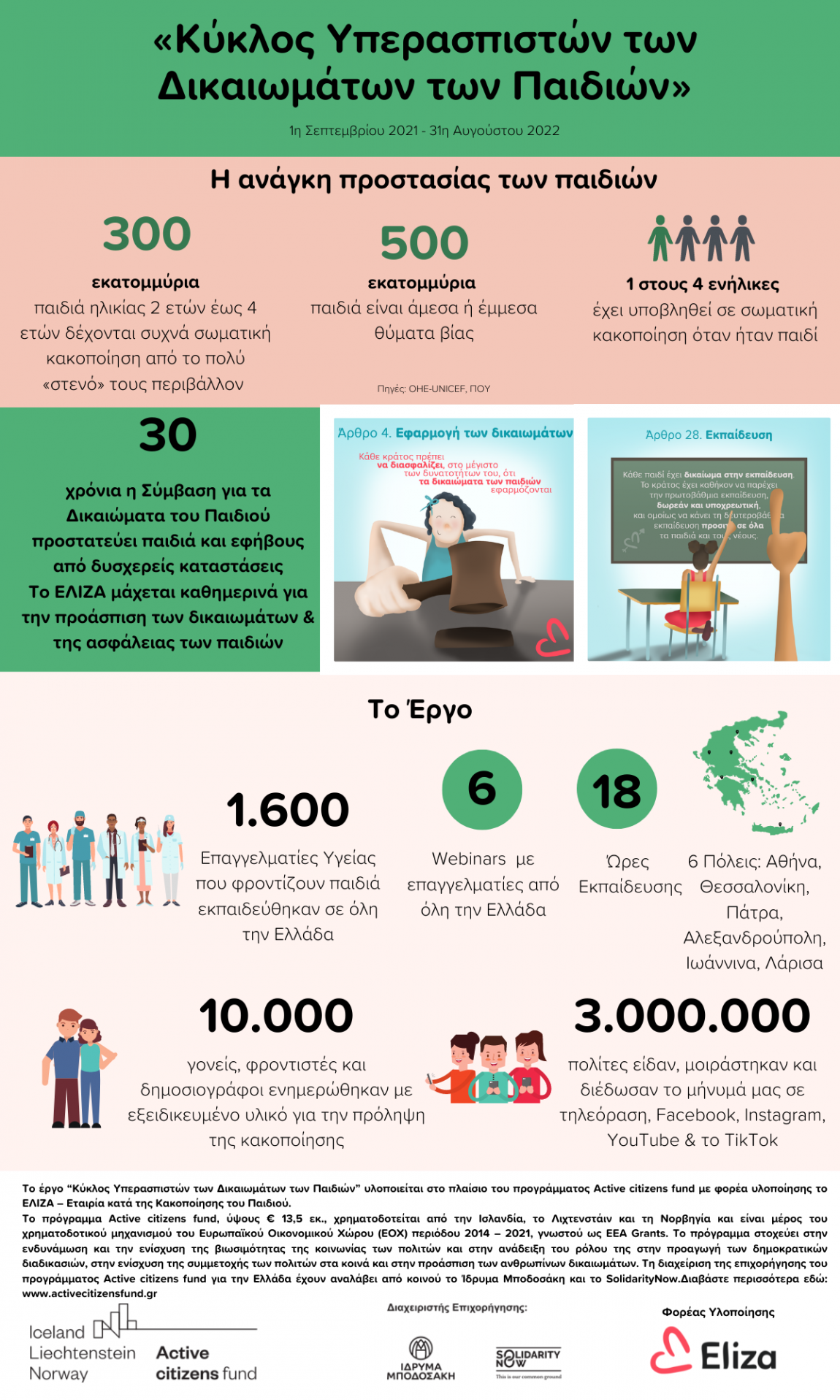 Με μεγάλη συμμετοχή και θετικό πρόσημο ολοκληρώνεται το έργο «Κύκλος Υπερασπιστών των Δικαιωμάτων των Παιδιών», από το ΕΛΙΖΑ–Εταιρία κατά της Κακοποίησης του Παιδιού. Μέσα σε 12 μήνες, υλοποιήθηκαν εκπαιδευτικές δράσεις για επαγγελματίες, καθώς και πανελλαδικής εμβέλειας πρωτοβουλίες για τους πολίτες, σε μία κοινή προσπάθεια για την προβολή και κυρίως την προάσπιση των Δικαιωμάτων των Παιδιών.