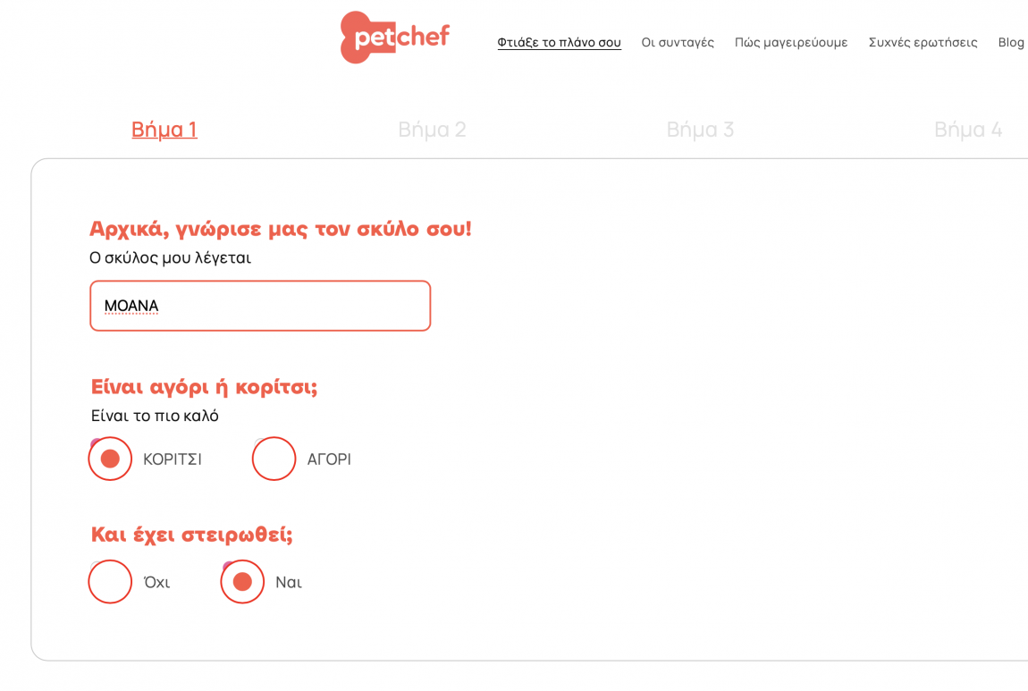 Τι έχετε να κάνετε; Δημιούργηστε  το δωρεάν εξατομικευμένο πλάνο για τον σκύλο σας  βάσει της ηλικίας του, των κιλών του και της δραστηριότητάς του συμπληρώνοντας το ερωτηματολόγιο στην αρχική σελίδα του Pet Chef.