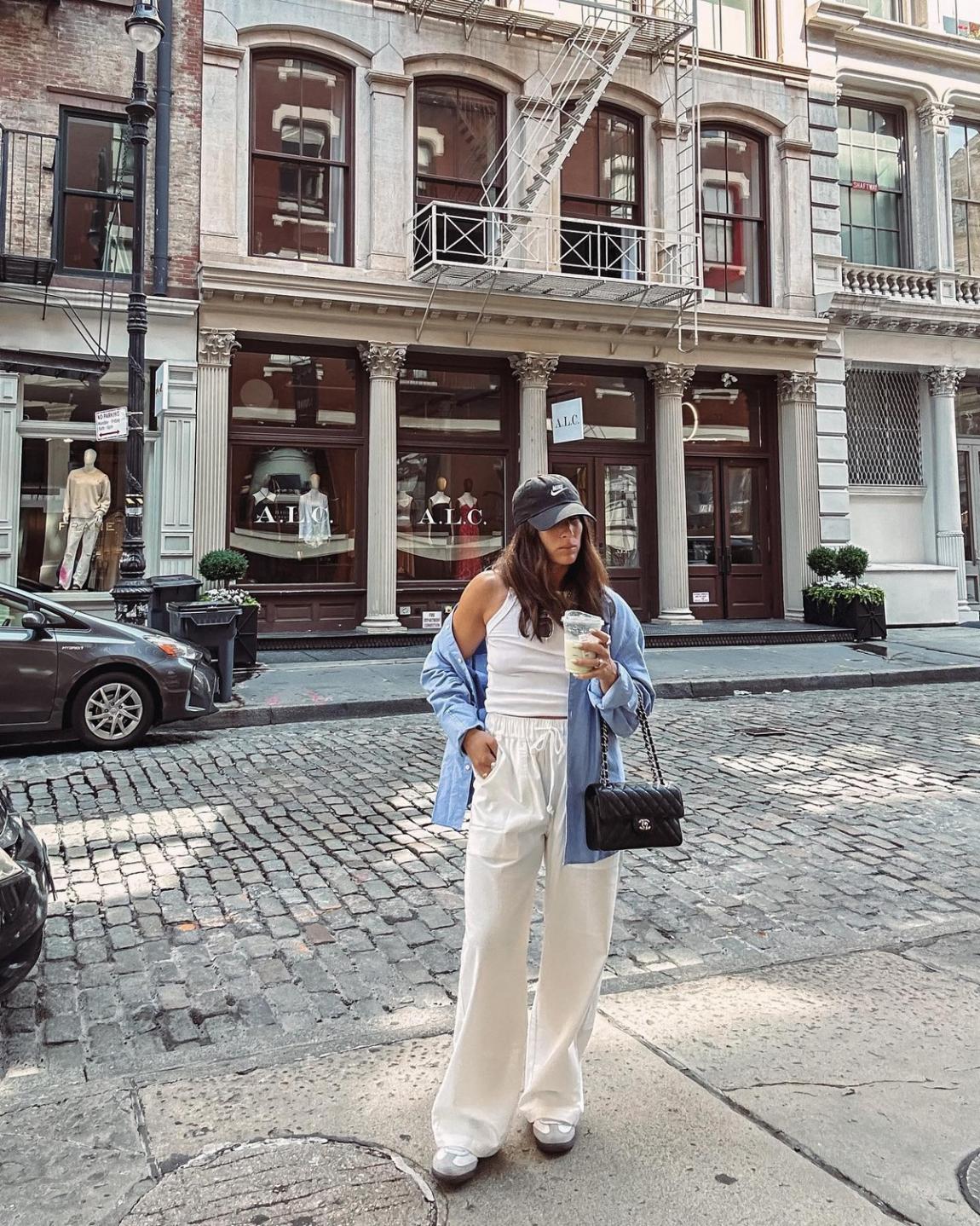 #3 Γαλάζιο πουκάμισο + λευκό tank top + λινό παντελόνι + sneakers + jockey καπέλο